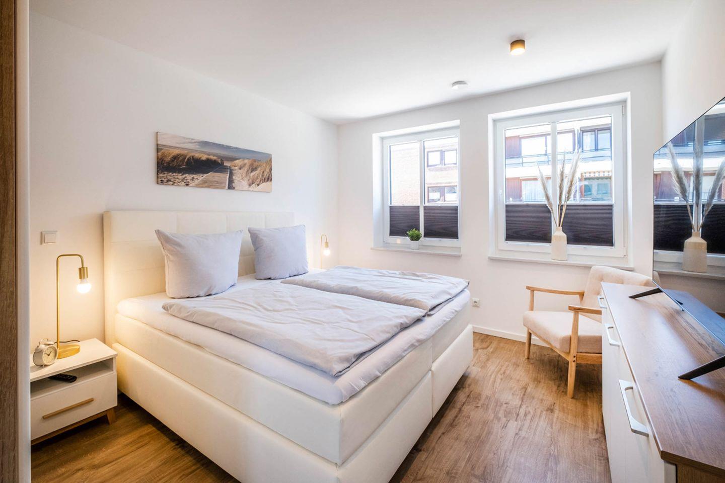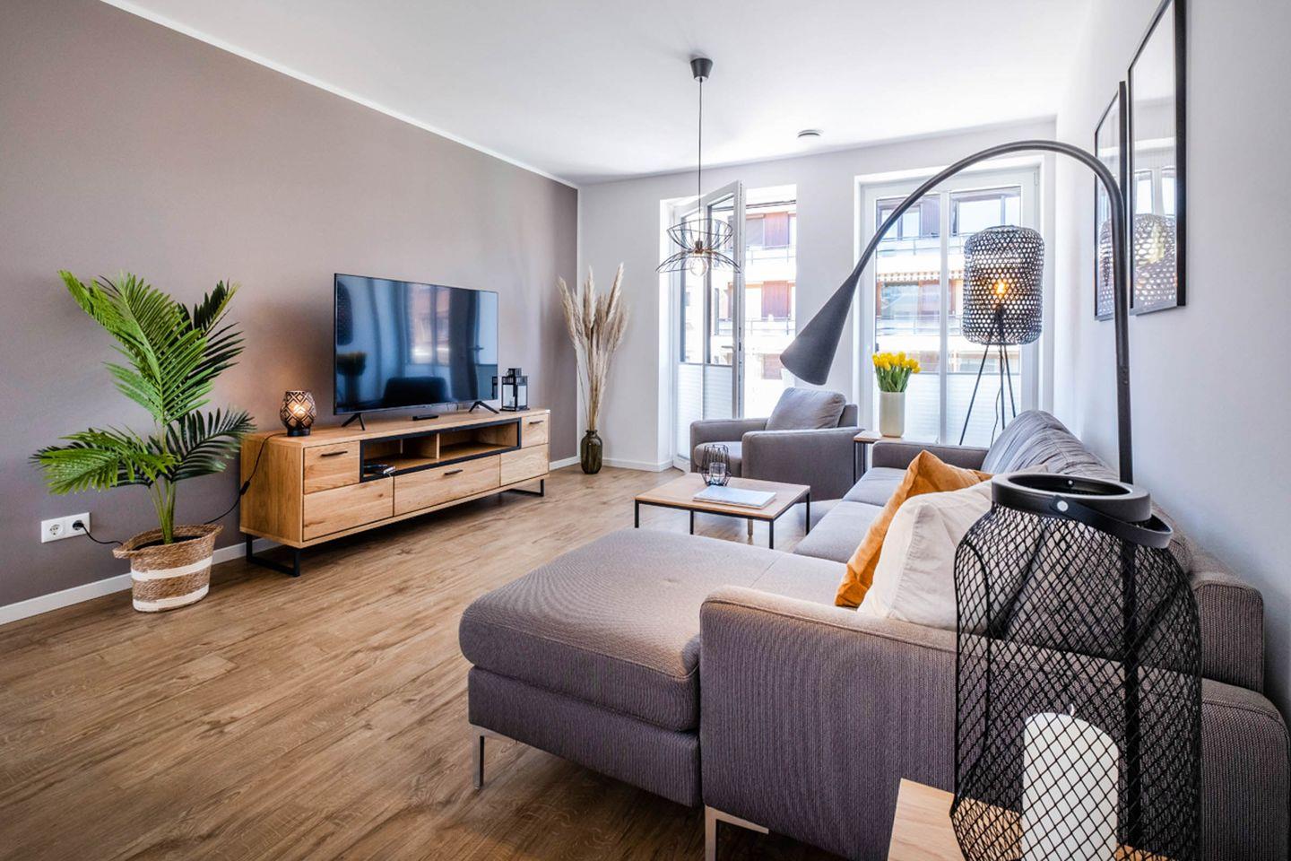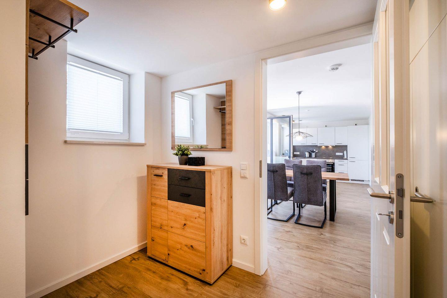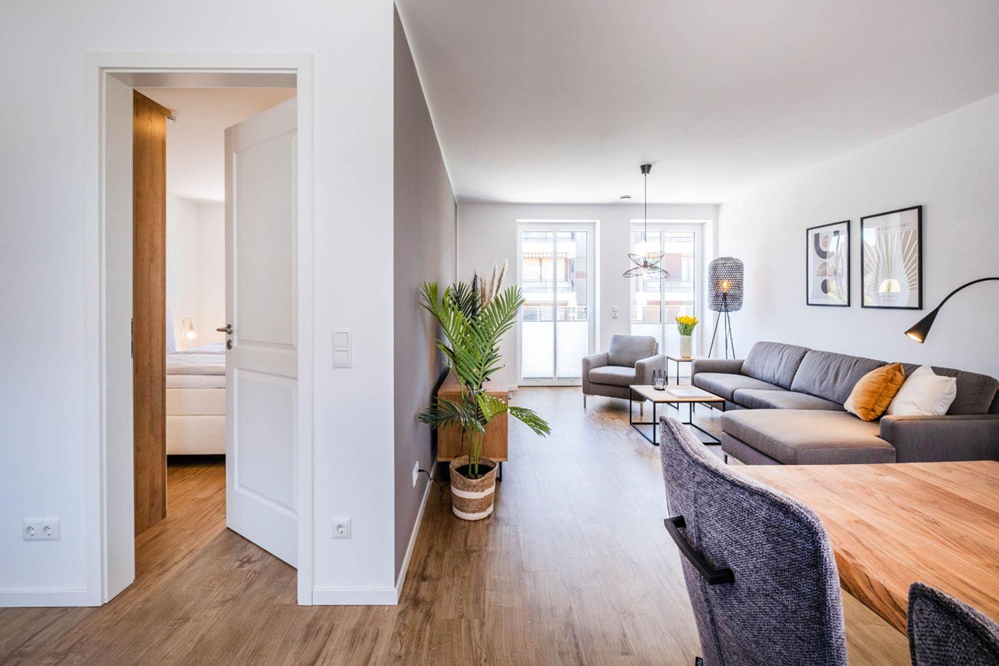 Das Apartment bietet mit 2 Schlafzimmern Platz für 4 Personen. Des Weiteren verfügt das Apartment über einen Wohn- und Essbereich mit einer offenen Küche. Das Tageslichtbad ist mit einer bodentiefen Dusche ausgestattet. Das Highlight des Apartments sind die beiden Balkone.