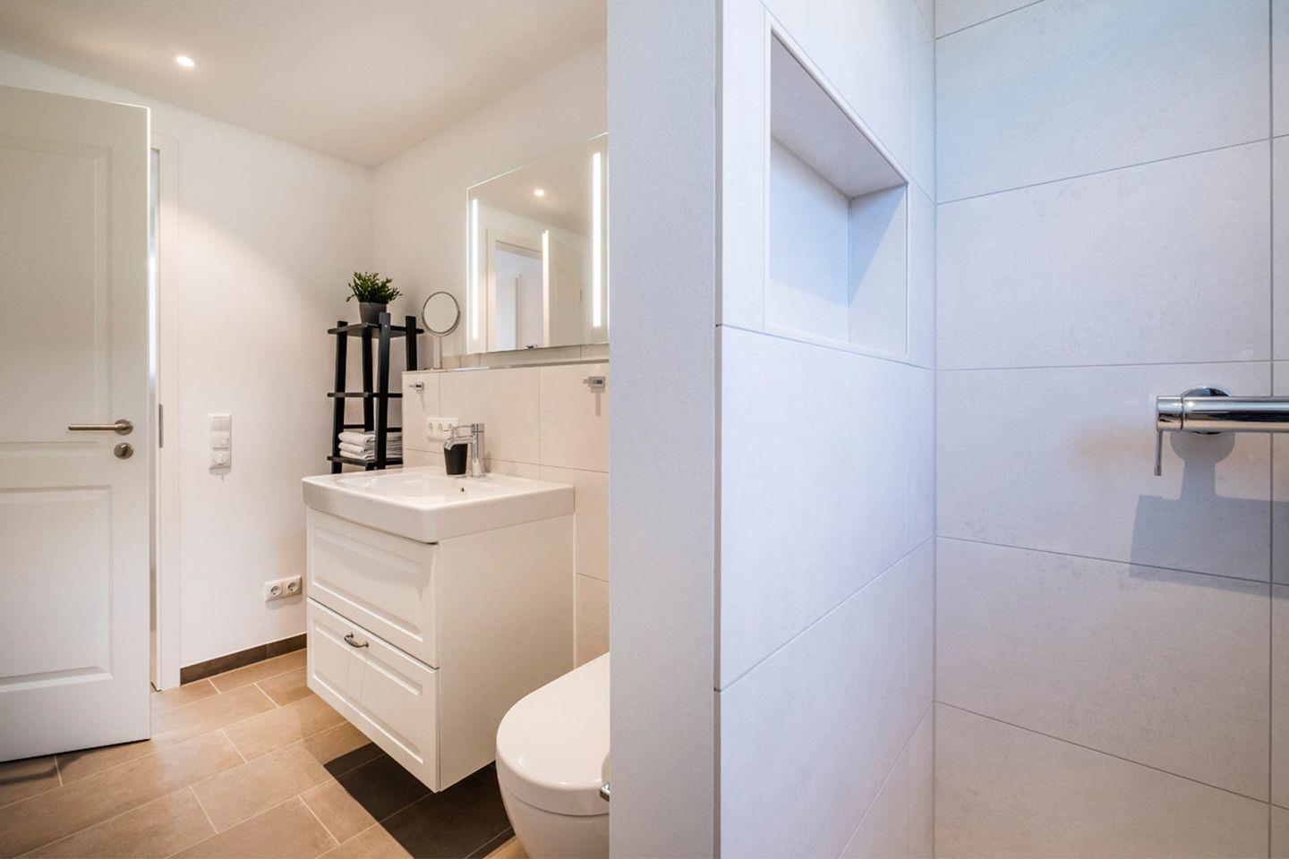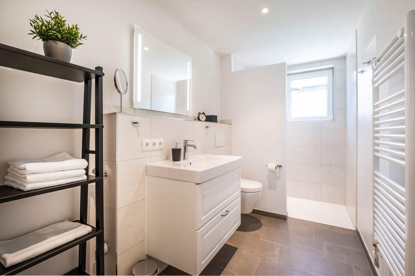 Badezimmer: Dusche, Handtuchheizung, Haar-Föhn, Kosmetikspiegel