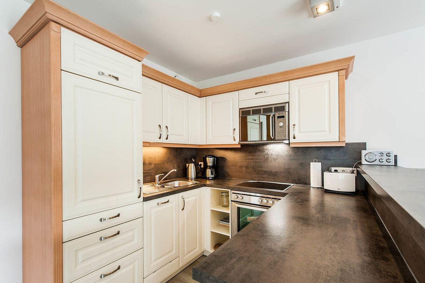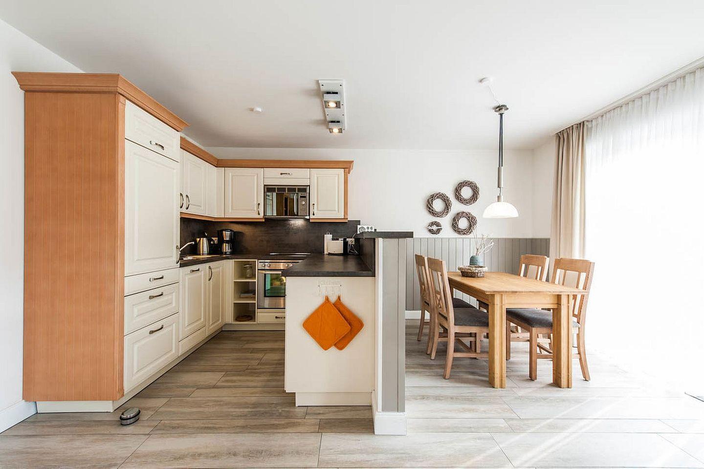 Wohnbereich mit vollausgestatteter, offener Küche 33 m² mit Ceranfeld, Backofen, Mikrowelle, Geschirrspülmaschine, Toaster, Mixer, Wasserkocher, Kaffeemaschine