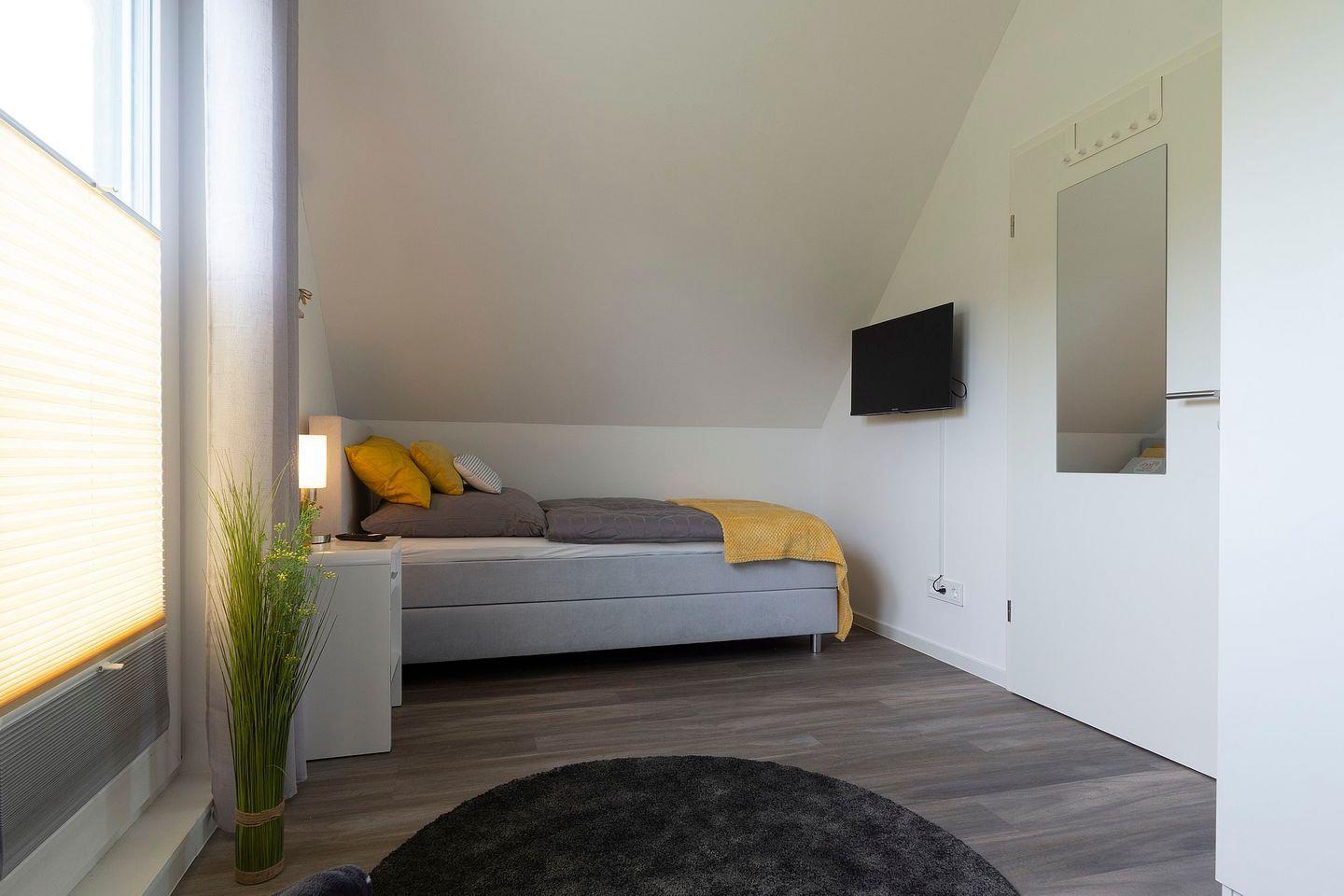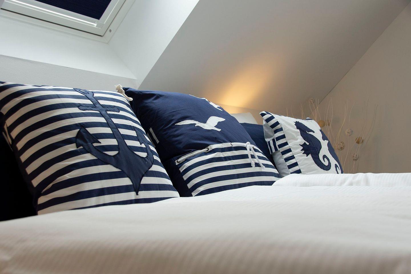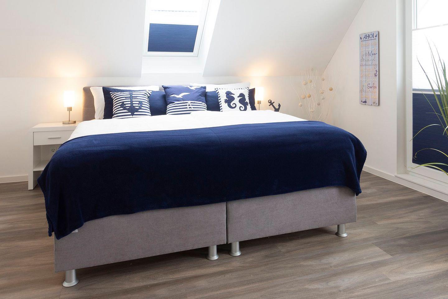 Im Obergeschoss befinden sich ein weiteres Duschbad und zwei Schlafzimmer. Die Bilder sprechen für sich. Die beiden oberen Schlafzimmer sind jeweils mit einem Fernseher ausgestattet und ein Schreibtisch, der auch zum Postkarten schreiben genutzt werden kann, ist vorhanden. Alle drei Schlafzimmer verfügen über hochwertige Boxspringbetten mit Kuschelfaktor.