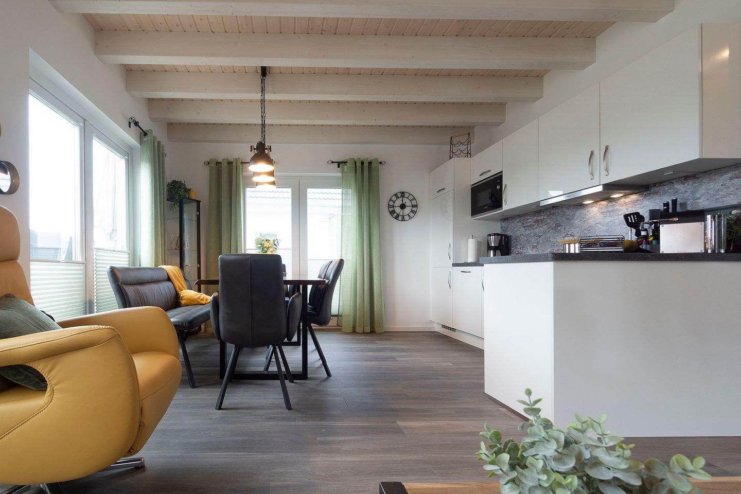 Das Wohnzimmer mit offener Küche strahlt Behaglichkeit aus, so dass sich jedermann sofort beim Betreten des Ferienhauses wie zuhause fühlt. Ein großartiger Fernseh-Sessel und eine gemütliche Couch laden zur Erholung ein. Ein großer Flatscreen-Fernseher sorgt für die Unterhaltung!