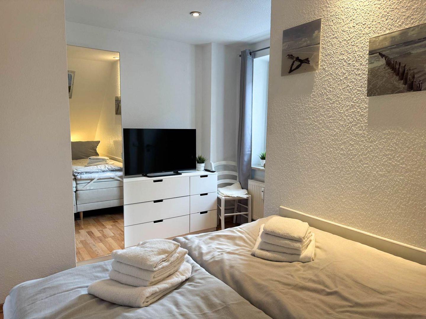 Das eine Schlafzimmer verfügt über ein Doppelbett (Masse: 1,80 x 2,00m) und TV, das andere Schlafzimmer verfügt über zwei Einzelbetten (0,80 x 2m), die man gleichzeitig als Doppelbett (1,60 x 2m) nutzen kann.