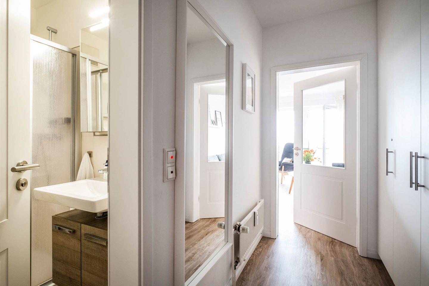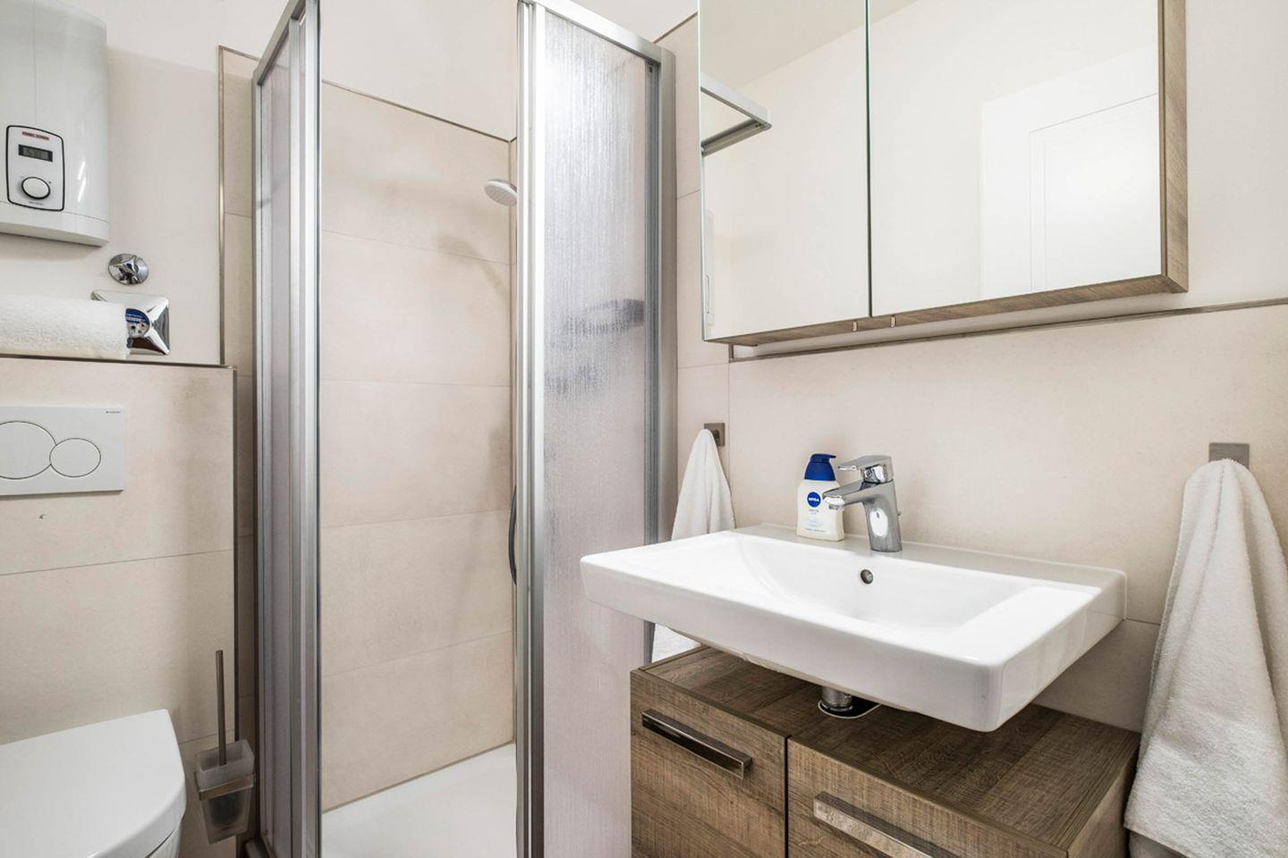 Das Badezimmer ist mit einer Dusche sowie Extras wie Handtuchheizung, Haar-Föhn, Kosmetikspiegel modern.