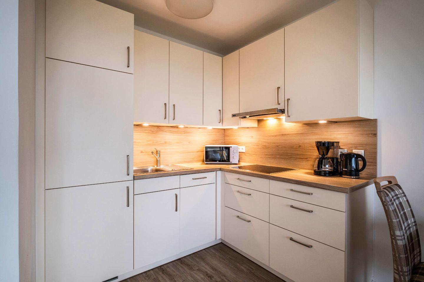 Küchenzeile: Cerankochfeld, Mikrowelle, Geschirrspüler, Kühlschrank mit Gefrierfach, Filterkaffee-Maschine, Wasserkocher, Toaster, Stabmixer