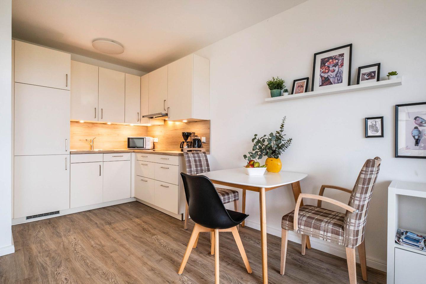 Die zum Wohnraum hin offene Küche ist mit Mikrowelle, Cerankochfeld und Geschirrspüler und vielen Utensilien sehr gut ausgestattet. Der Essbereich befindet sich direkt daneben.