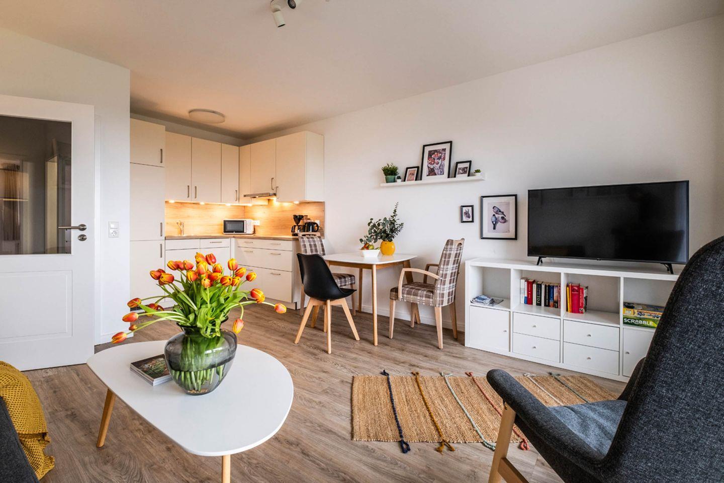 Im Eingangsbereich befinden sich direkt die Garderobe sowie der Durchgang zum Wohnzimmer, welches mit einem gemütlichen Sofa sowie einem Flachbildschirm ausgestattet ist. Vom Wohnzimmer kommen Sie direkt auf den Balkon, von dem Sie einen fantastischen Blick auf die Nordsee genießen können.