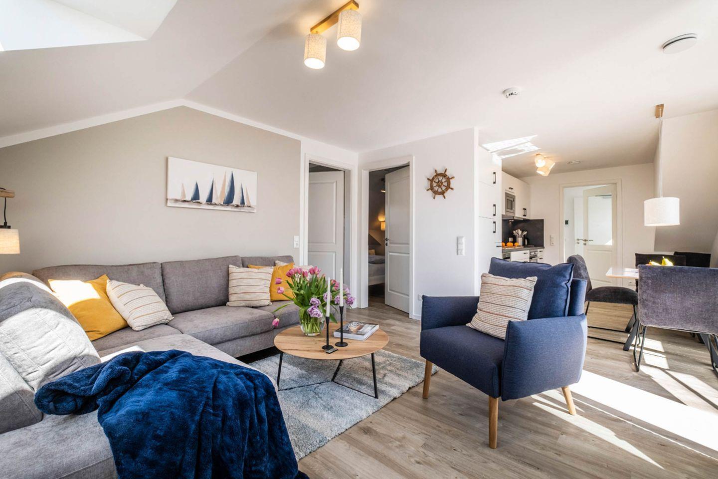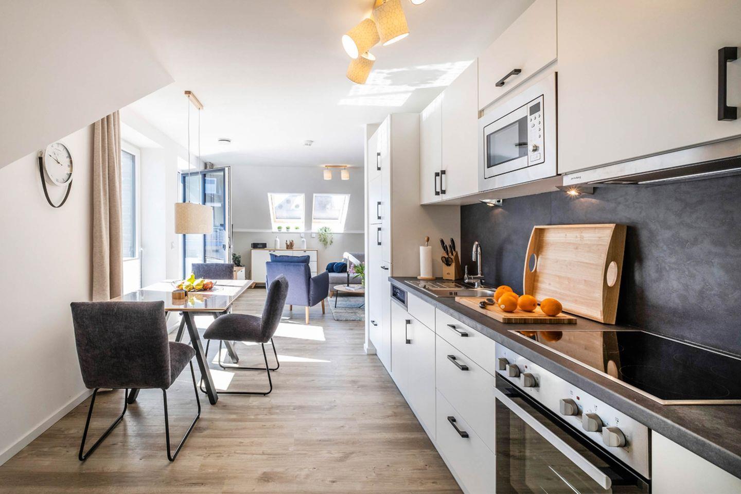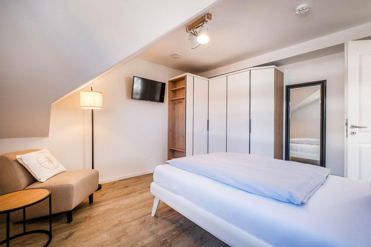 Das Apartment 6 bietet mit 2 Schlafzimmern Platz für 3 Personen. Des Weiteren verfügt das Apartment über einen Wohn- und Essbereich mit einer offenen Küche. Das Tageslichtbad ist mit einer bodentiefen Dusche ausgestattet.