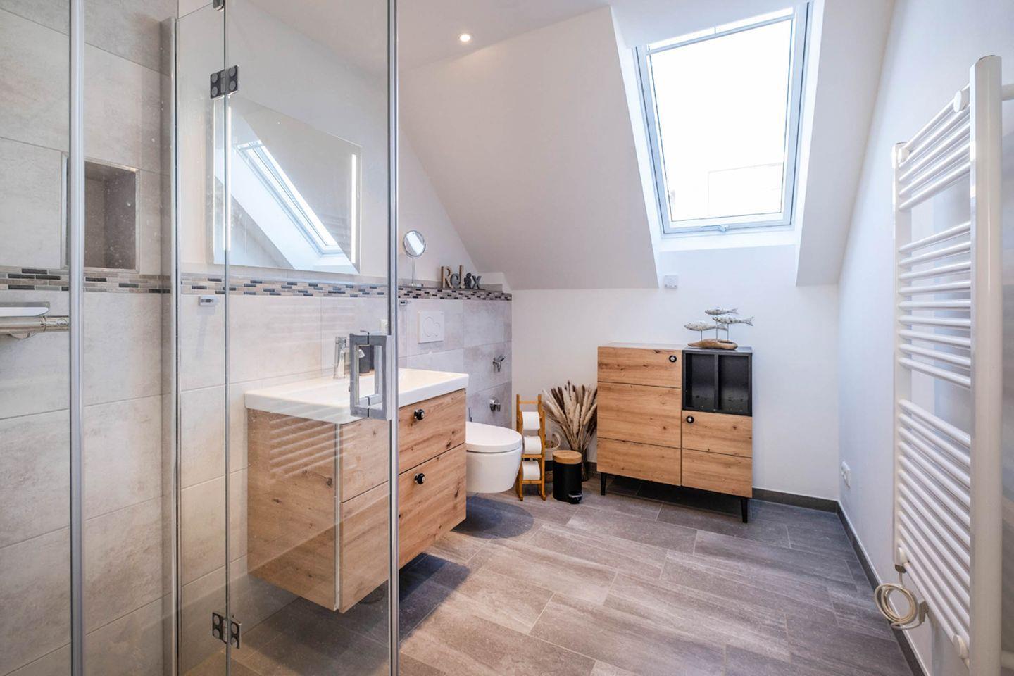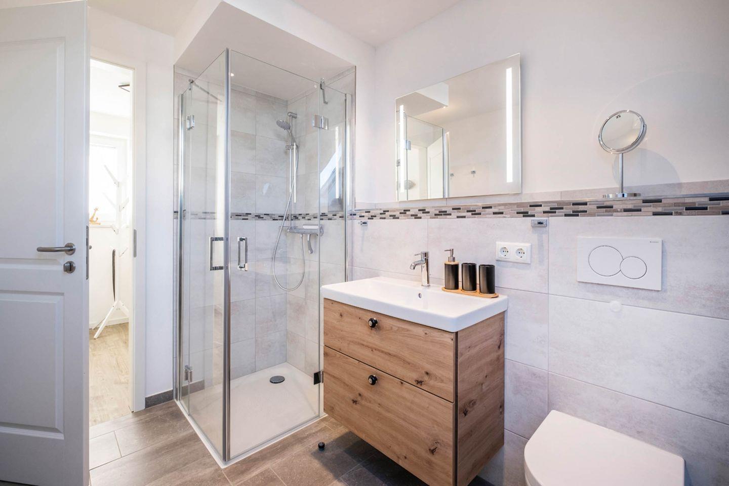 Badezimmer: Dusche, Handtuchheizung, Haar-Föhn, Kosmetikspiegel