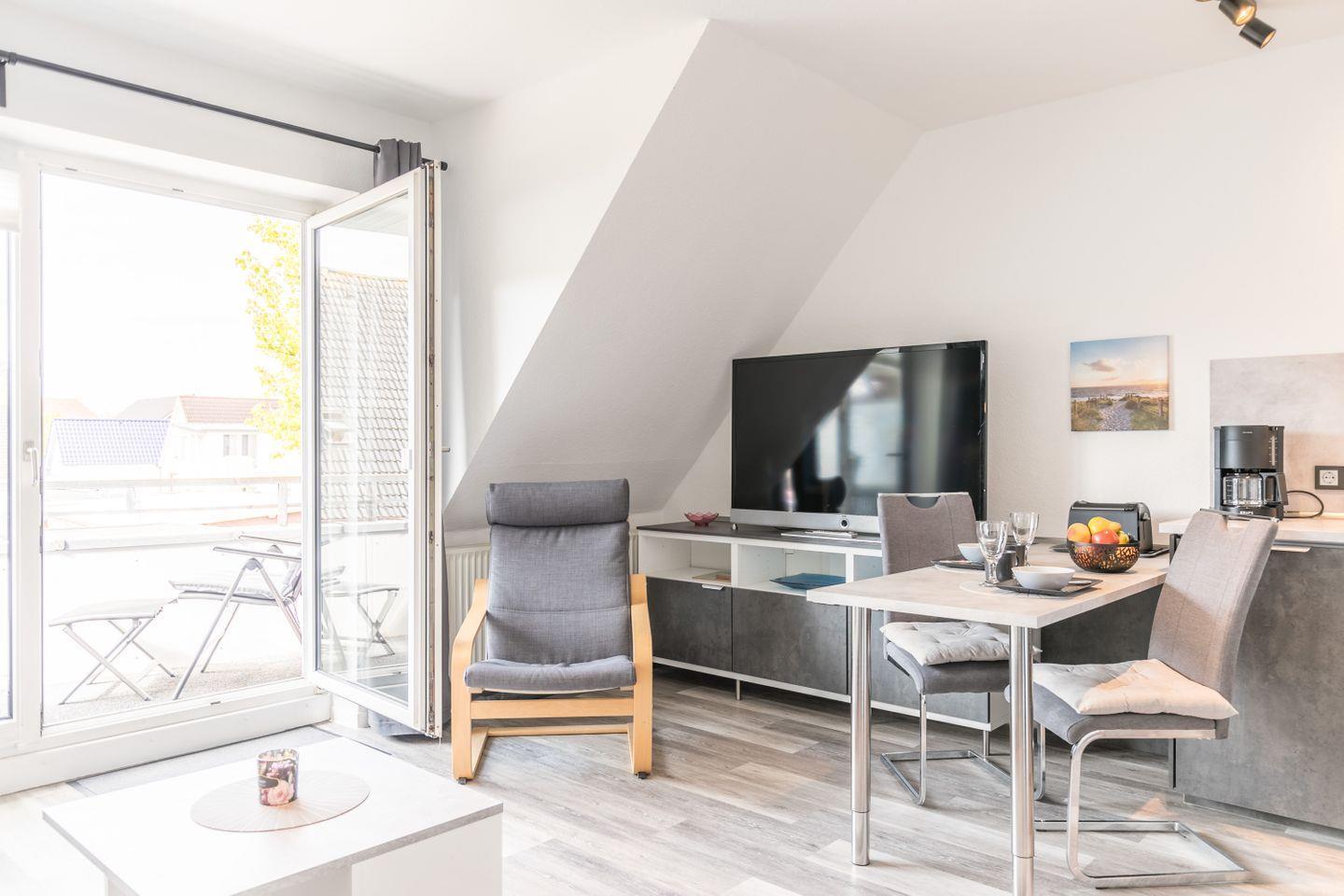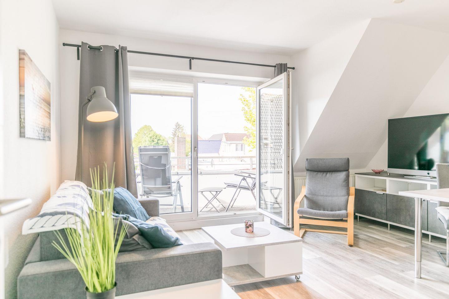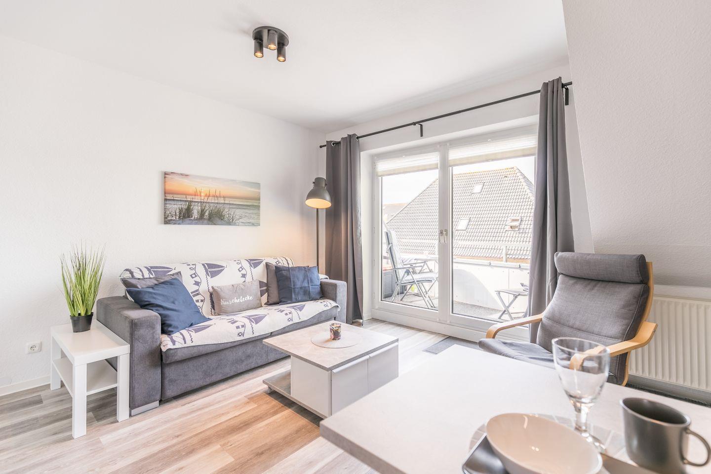 Moderne Ferienwohnung mit Balkon + Strandkorb am Strand, in ruhiger Appartementanlage in zentraler Lage.