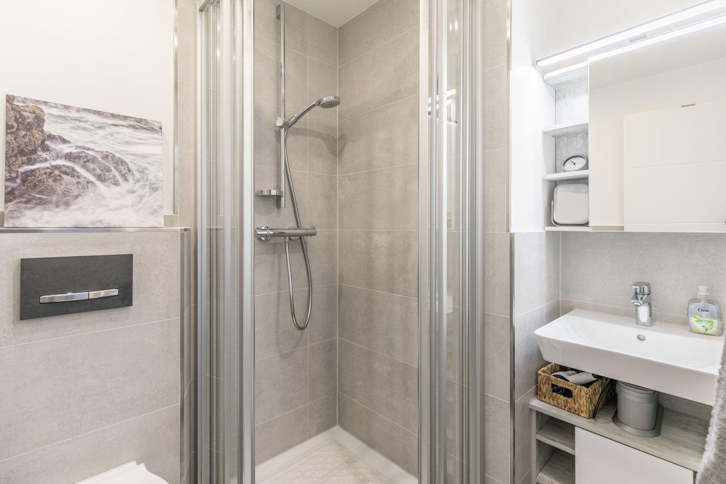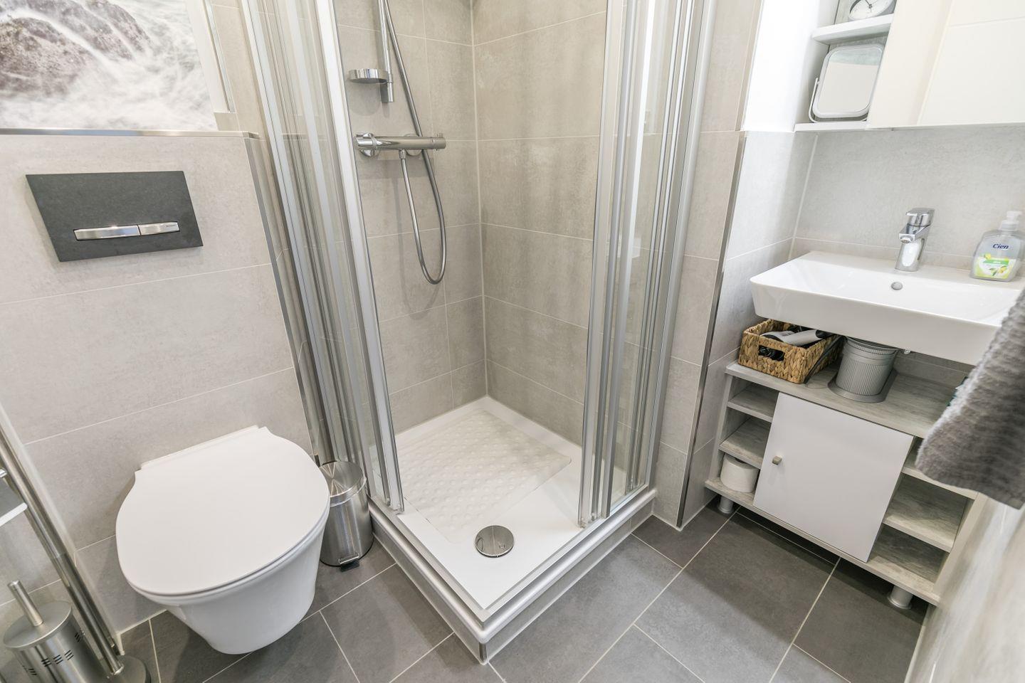 Dusche, WC, Waschbecken, beleuchteter Spiegelschrank, Handtuchheizkörper, Fön