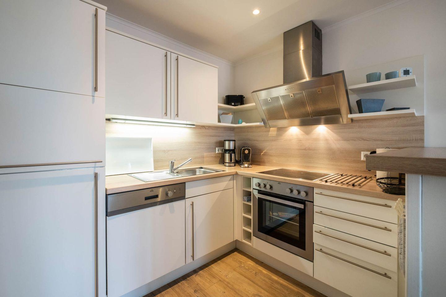 - Küche: Ceranfeld, Backofen, Mikrowelle, Geschirrspülmaschine, Toaster, Wasserkocher, Kaffeemaschine