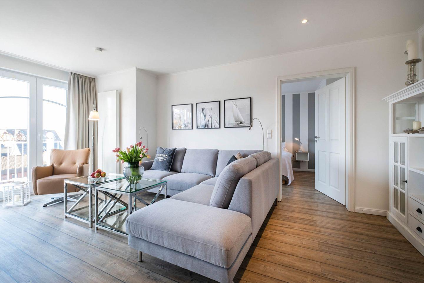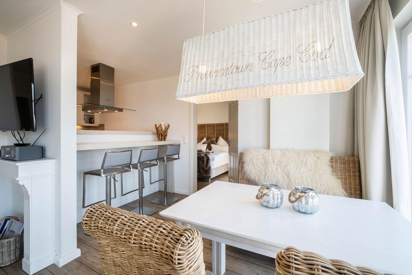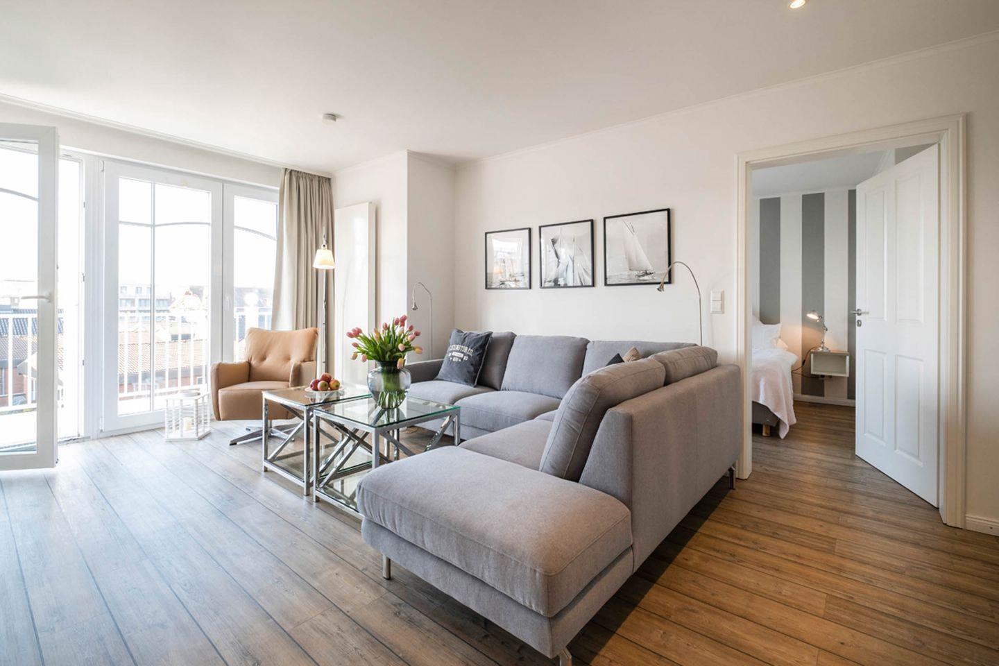 Aufgeteilt ist das Apartment in einen großzügigen Wohn- und Essbereich mit offener Küche, zwei Schlafzimmer und zwei großzügige Bäder. Ein Highlight des Apartments ist die Sauna im eigenen Badezimmer.