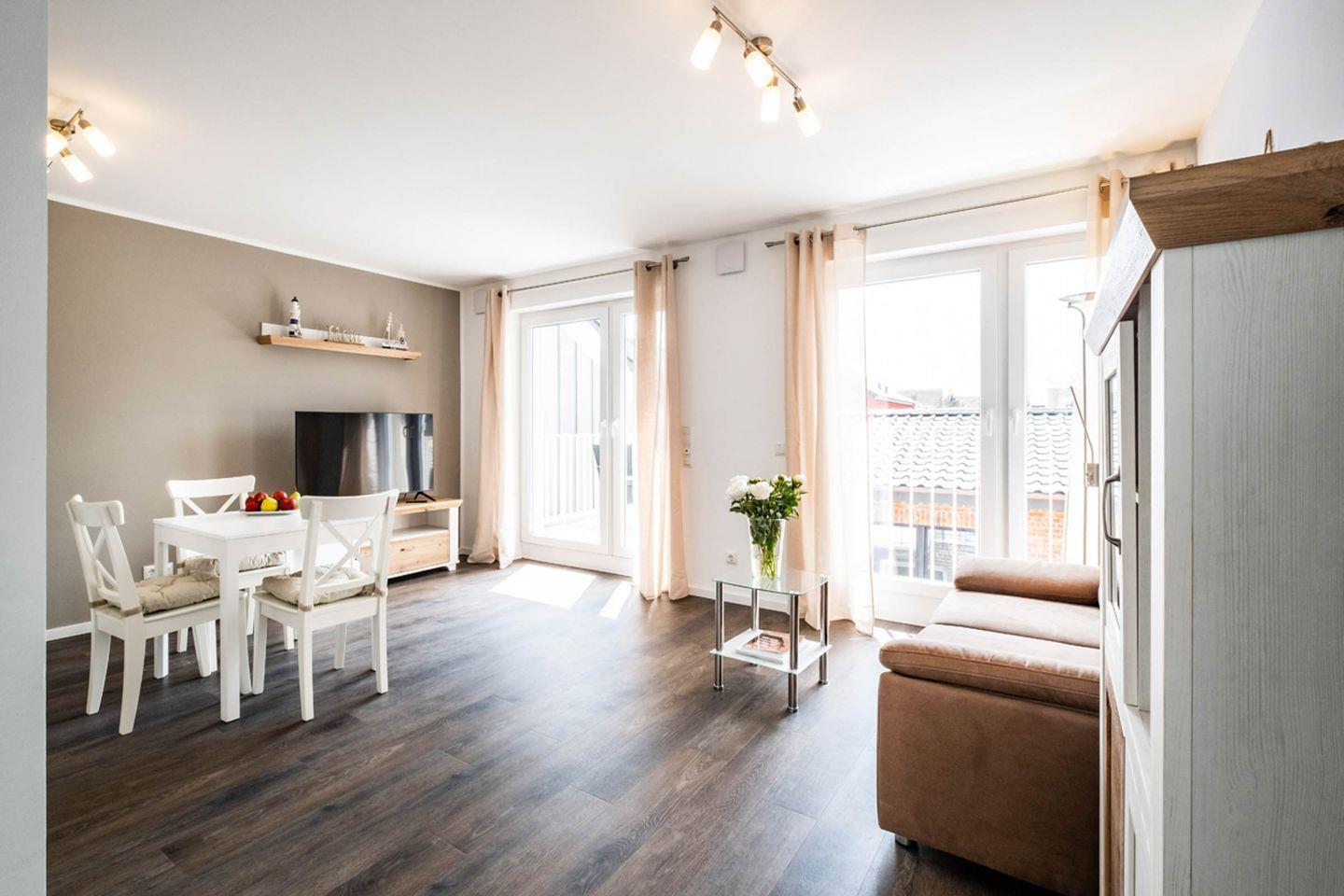 Moderne Ferienwohnung mit Balkon, WLAN und privatem Parkplatz in Büsum, nahe Hafen und Strand.
