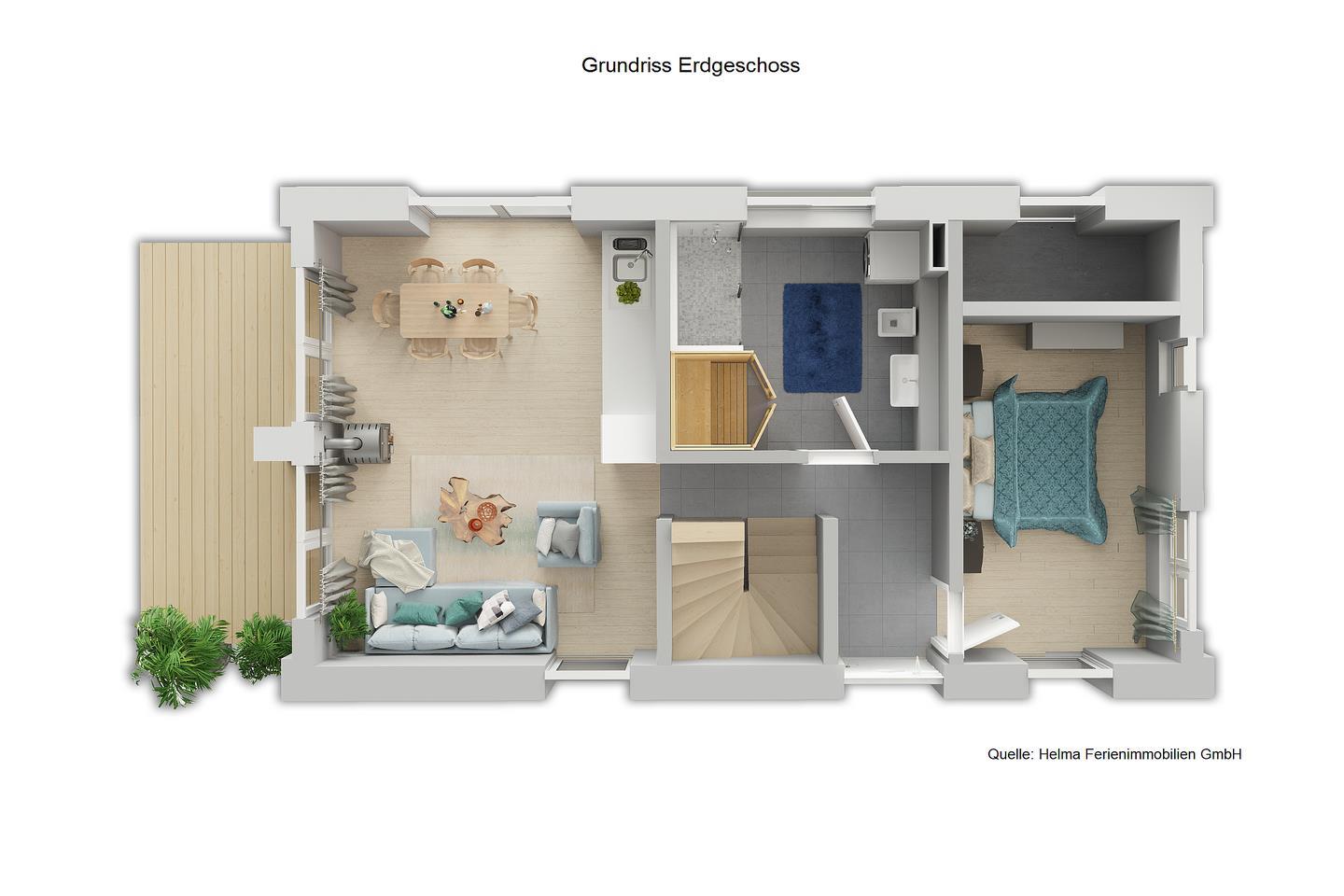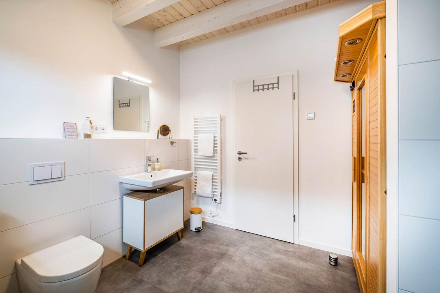 Weiterhin befindet sich im Erdgeschoss ein Duschbad mit Infrarotkabine. Nach einem ausgiebigen Spaziergang in der Natur kann man hier wieder Kräfte tanken! Auch ein Schlafzimmer mit einem bequemen Boxspring-Doppelbett ist hier vorhanden, das an Gemütlichkeit nicht zu übertreffen ist.