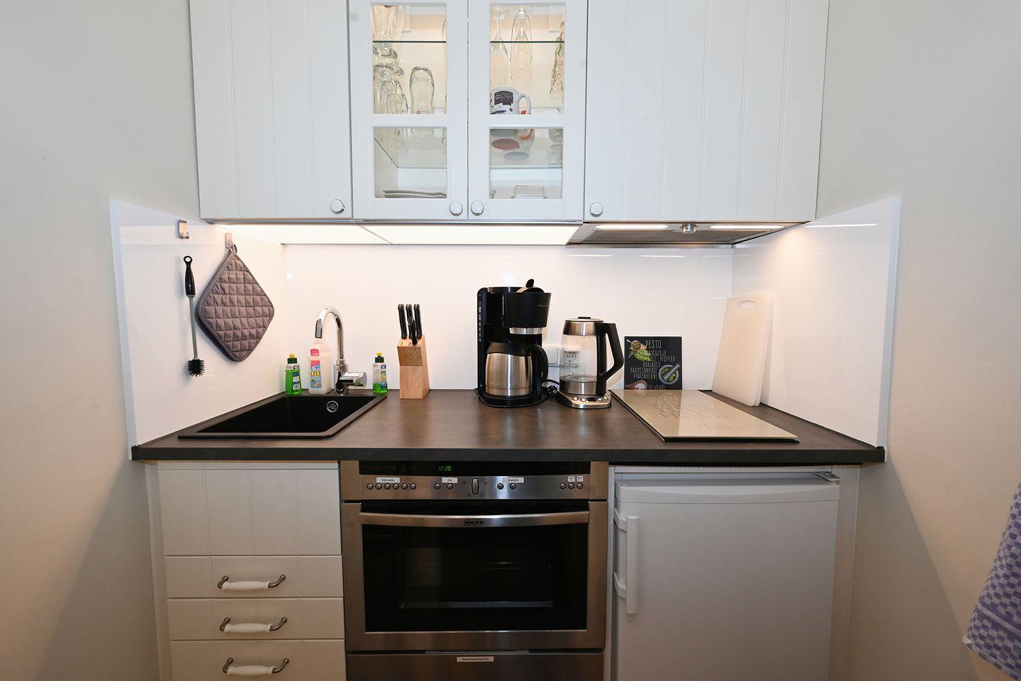 Die Küche ist komplett ausgestattet mit Geschirrspüler, Backofen und Mikrowelle.