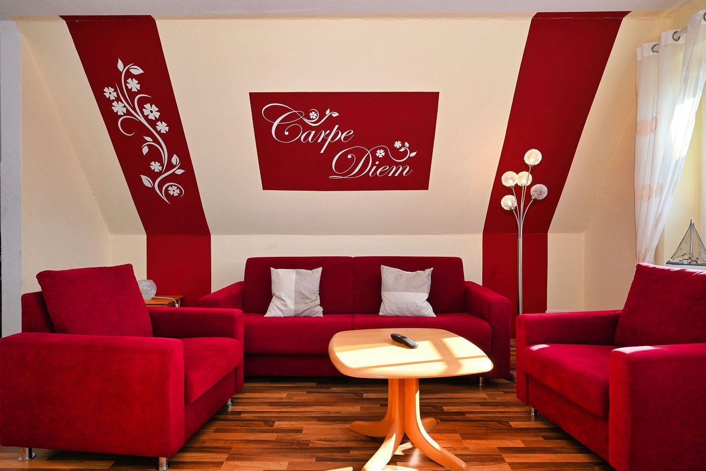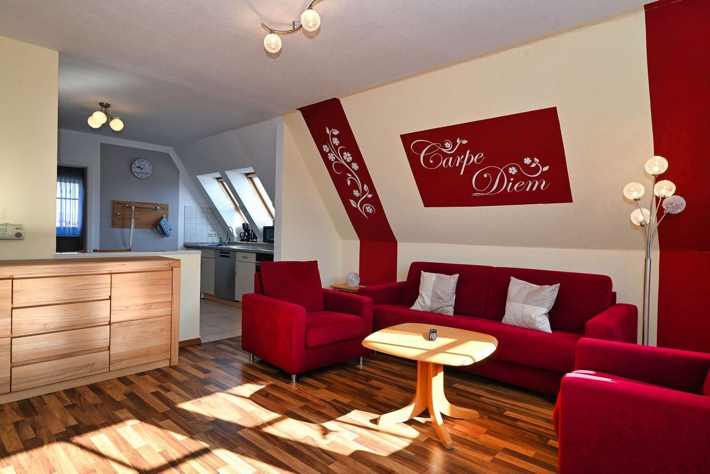 Das Schlafsofa im Wohnzimmer bietet zwei weitere Schlafgelegenheiten.