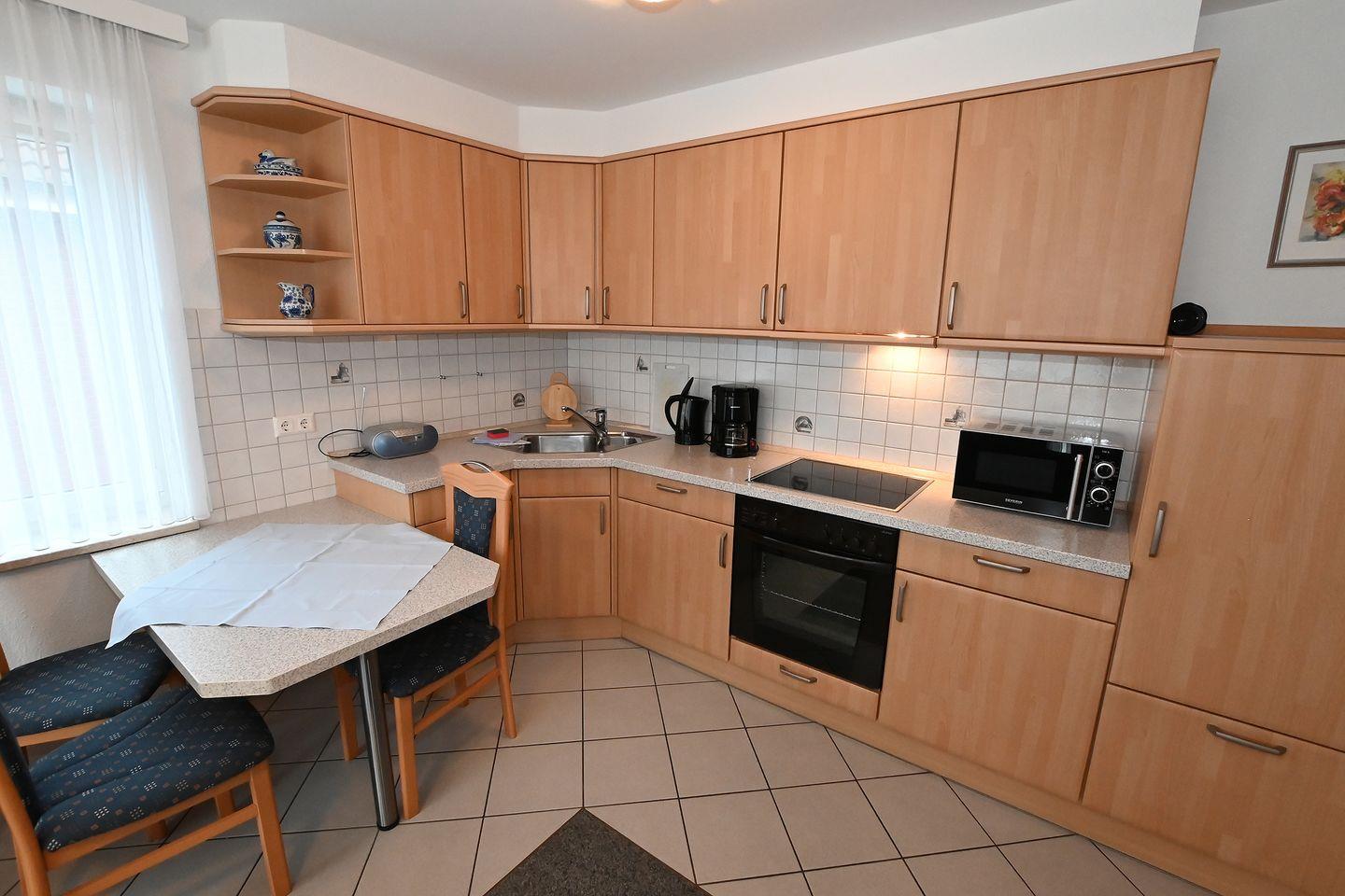 Auf gleicher Ebene befindet sich eine komplett ausgestattete Kochnische, sowie eine gemütliche Essecke.