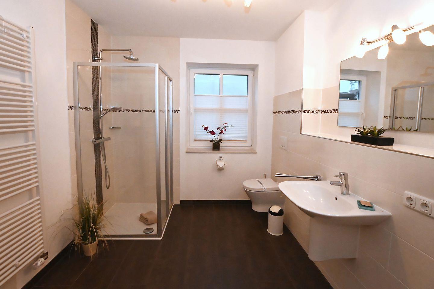 Das moderne und hellgeflieste Badezimmer verfügt über eine Glasdusche und ein WC.