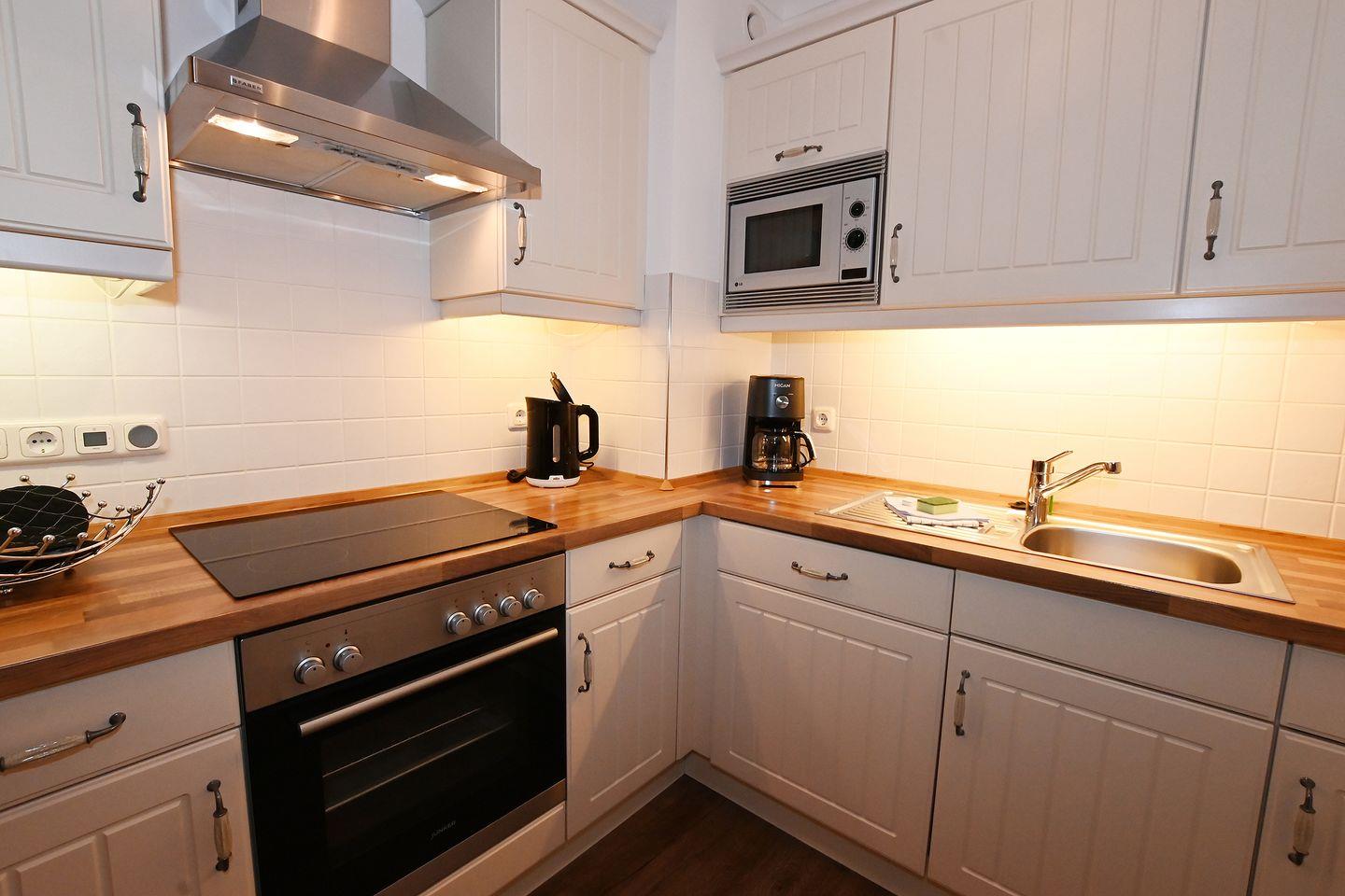 Hier ist eine vollausgestattete Küchenzeile vorhanden inklusive einem Essbereich.