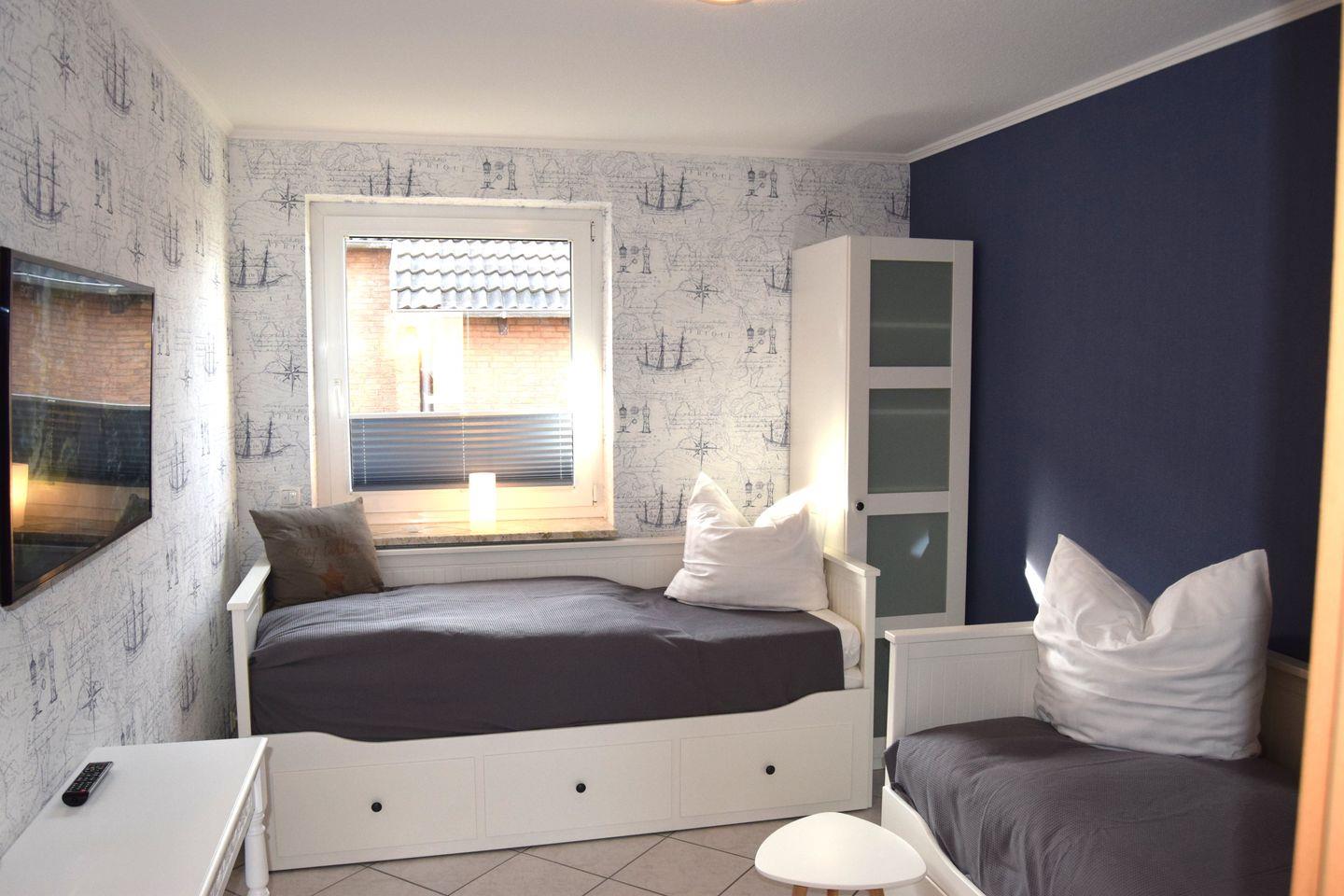 In dem Schlafzimmer mit den beiden Einzelbetten kann eines der Einzelbetten auf 1,60m ausgezogen werden, sodass dort zwei Personen schlafen könnten.
