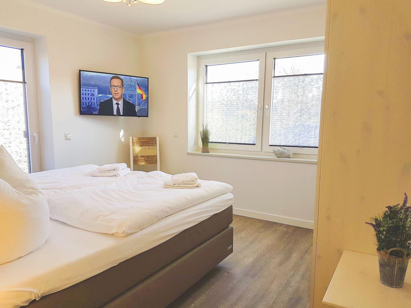 Es erwarten Sie Designer-Möbel, Boxspringbetten der Marke Schlaraffia mit Topper, 3-fach verglaste Fenster mit elektr. Außenjalousien, Fußbodenheizung und Lüftungsanlage, W-Lan und Smart-TV. Im Wohnzimmer, sowie in den Schlafzimmern befindet sich jeweils ein Smart-TV.