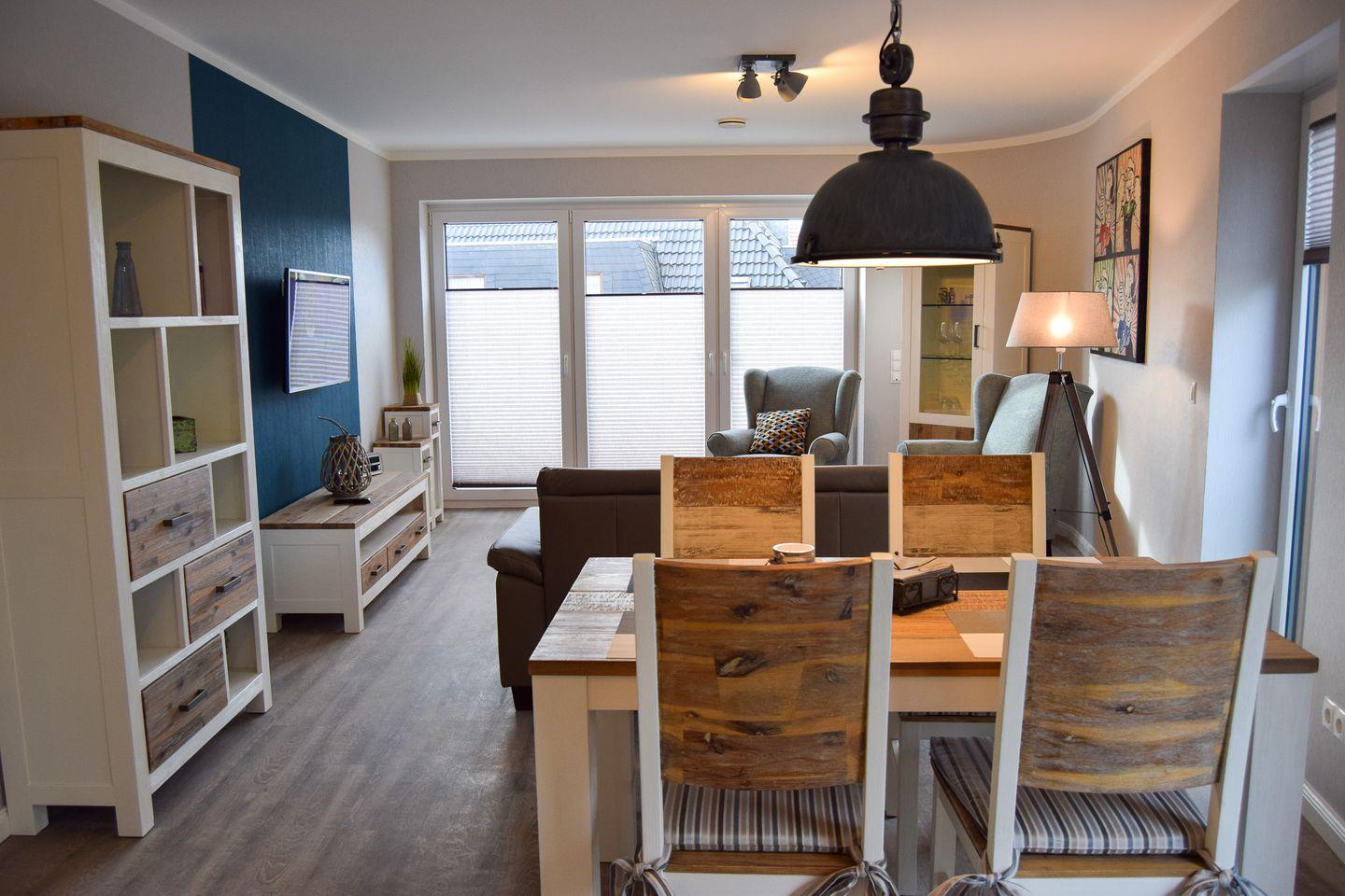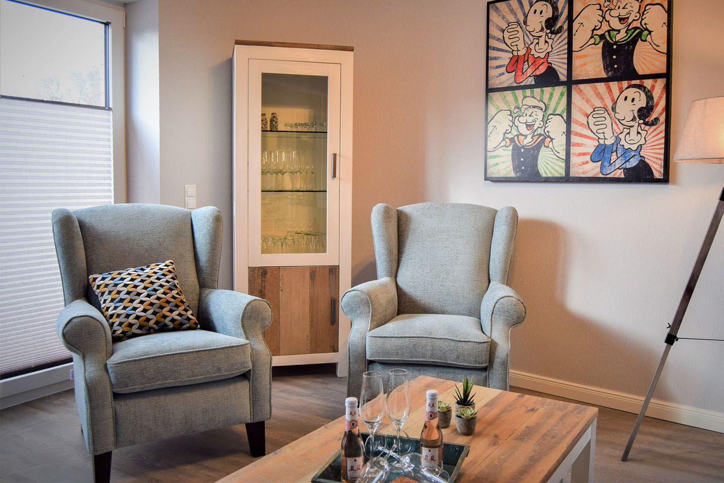 Modernes Nichtraucher-Apartment in Büsum mit Designer-Möbeln und Balkon für erholsame Urlaubstage.