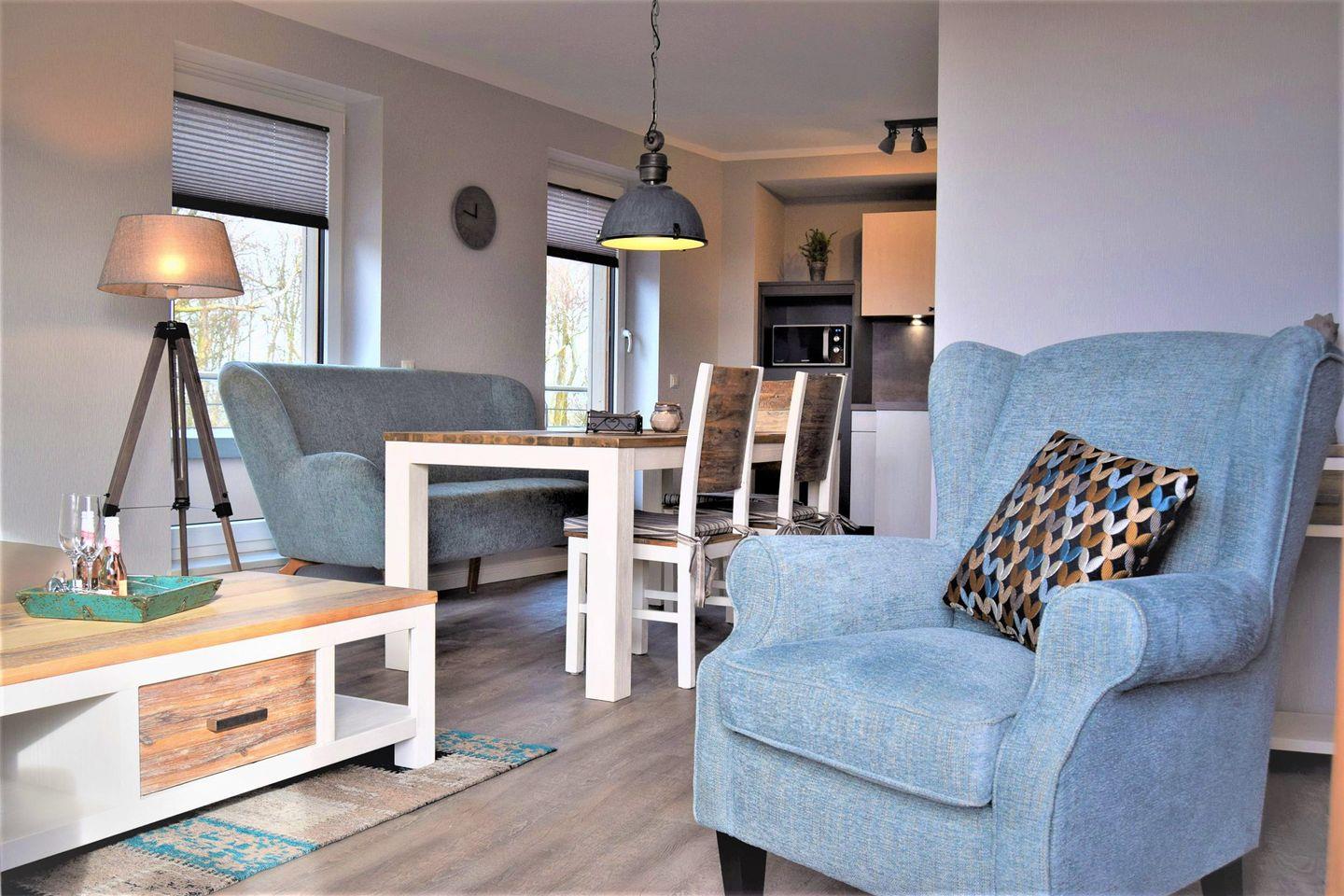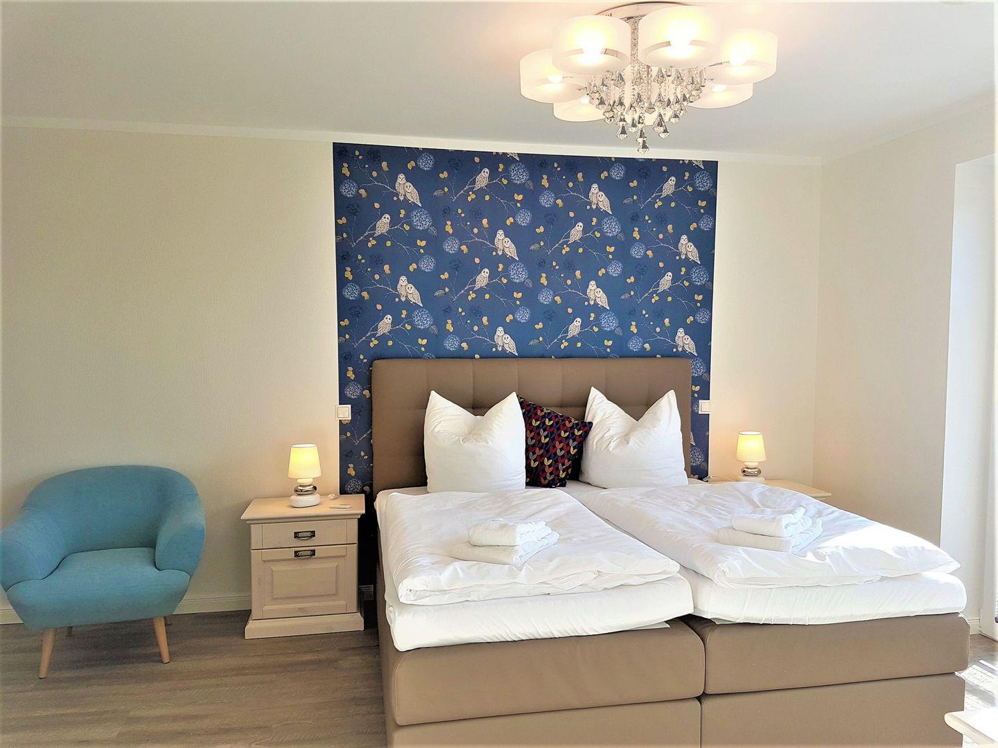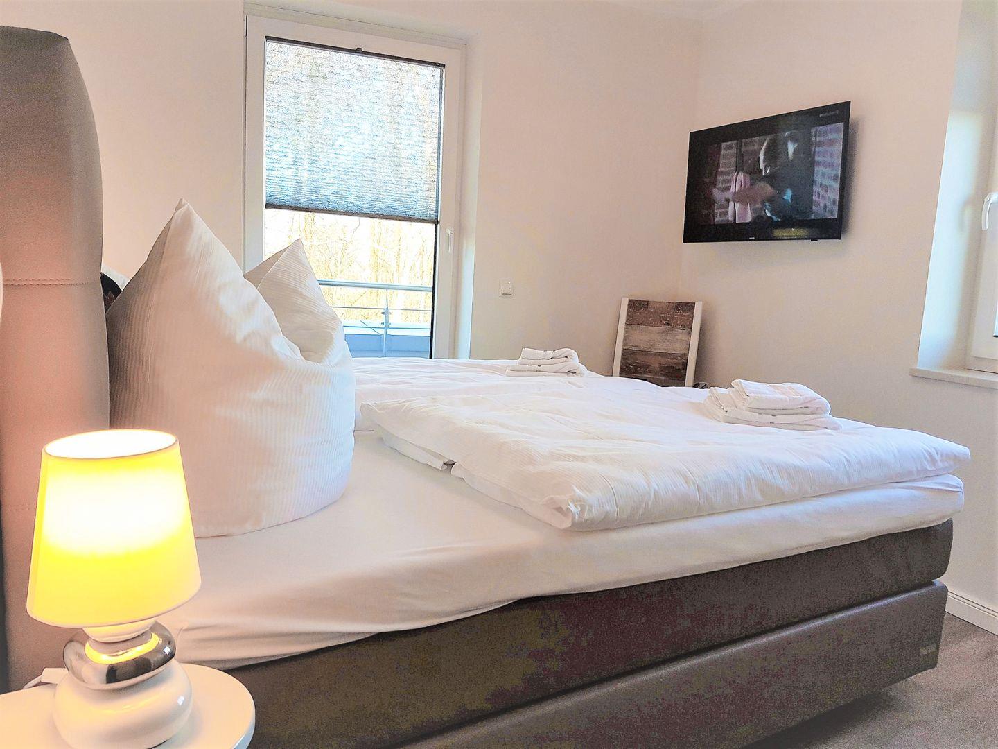 Es erwarten Sie Designer-Möbel, Boxspringbetten der Marke Schlaraffia mit Topper, 3-fach verglaste Fenster mit elektr. Außenjalousien, Fußbodenheizung und Lüftungsanlage, W-Lan und Smart-TV. Im Wohnzimmer, sowie in den Schlafzimmern befindet sich jeweils ein Smart-TV .