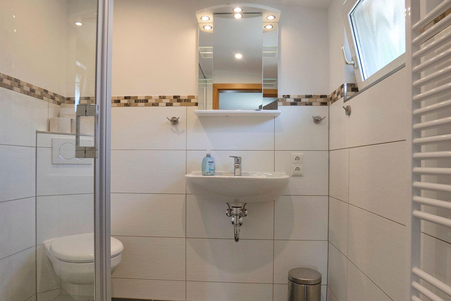 Dusche. Im Hauswirtschaftsraum gibt es einen Staubsauger sowie eine Waschmaschine zur kostenfreien