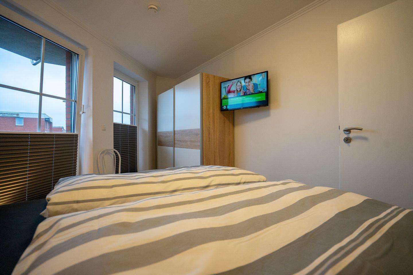 Das Schlafzimmer ist mit einem Doppelbett und einem Smart-TV ausgestattet. Von hier aus erreichen Sie den zweiten Balkon mit Südwest-Ausrichtung.