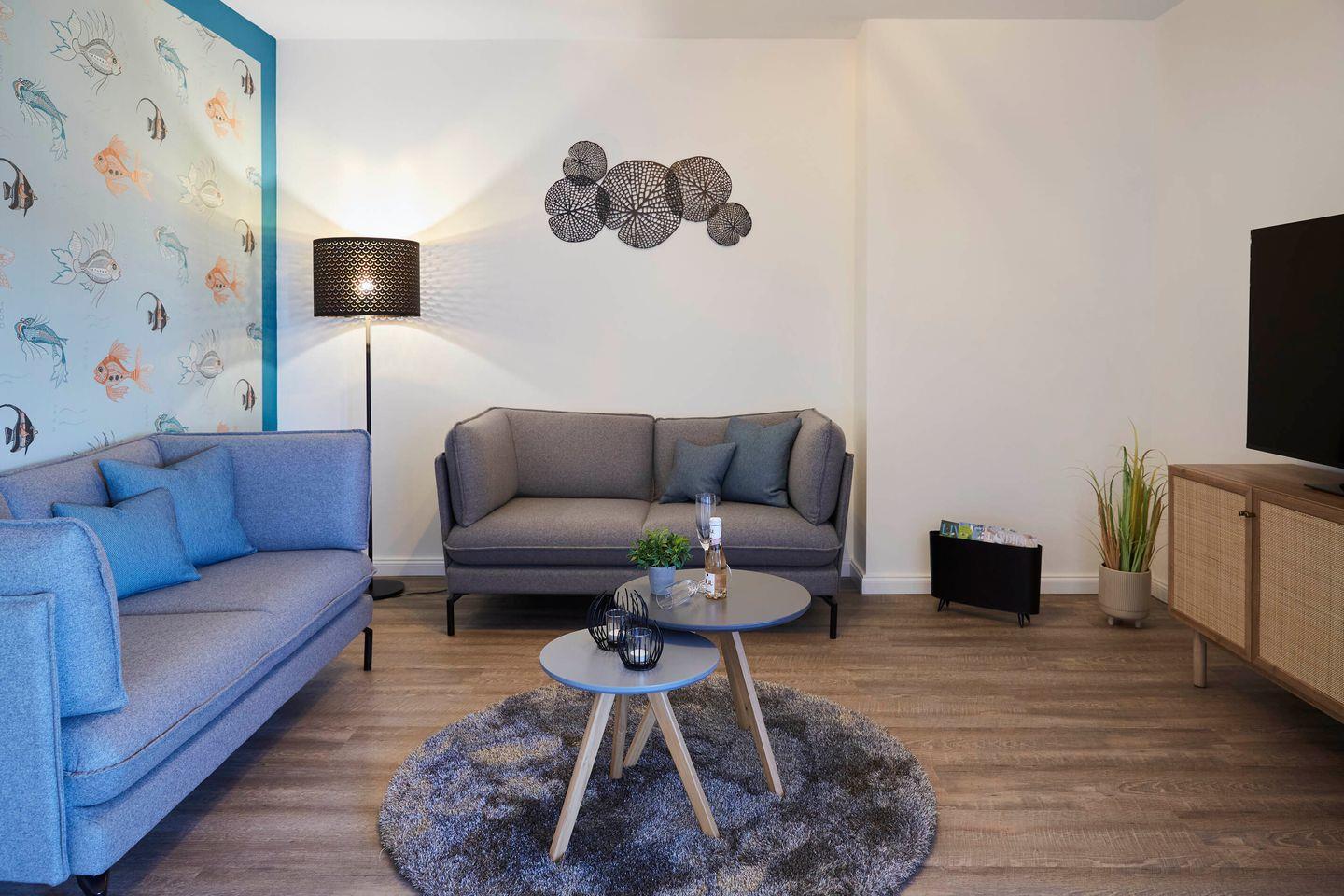 Modernes Zweizimmer-Apartment in Büsum mit Designer-Möbeln, Sauna, Balkon und Meerblick, nur 100 m vom Strand entfernt.