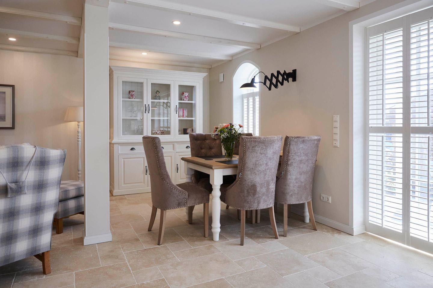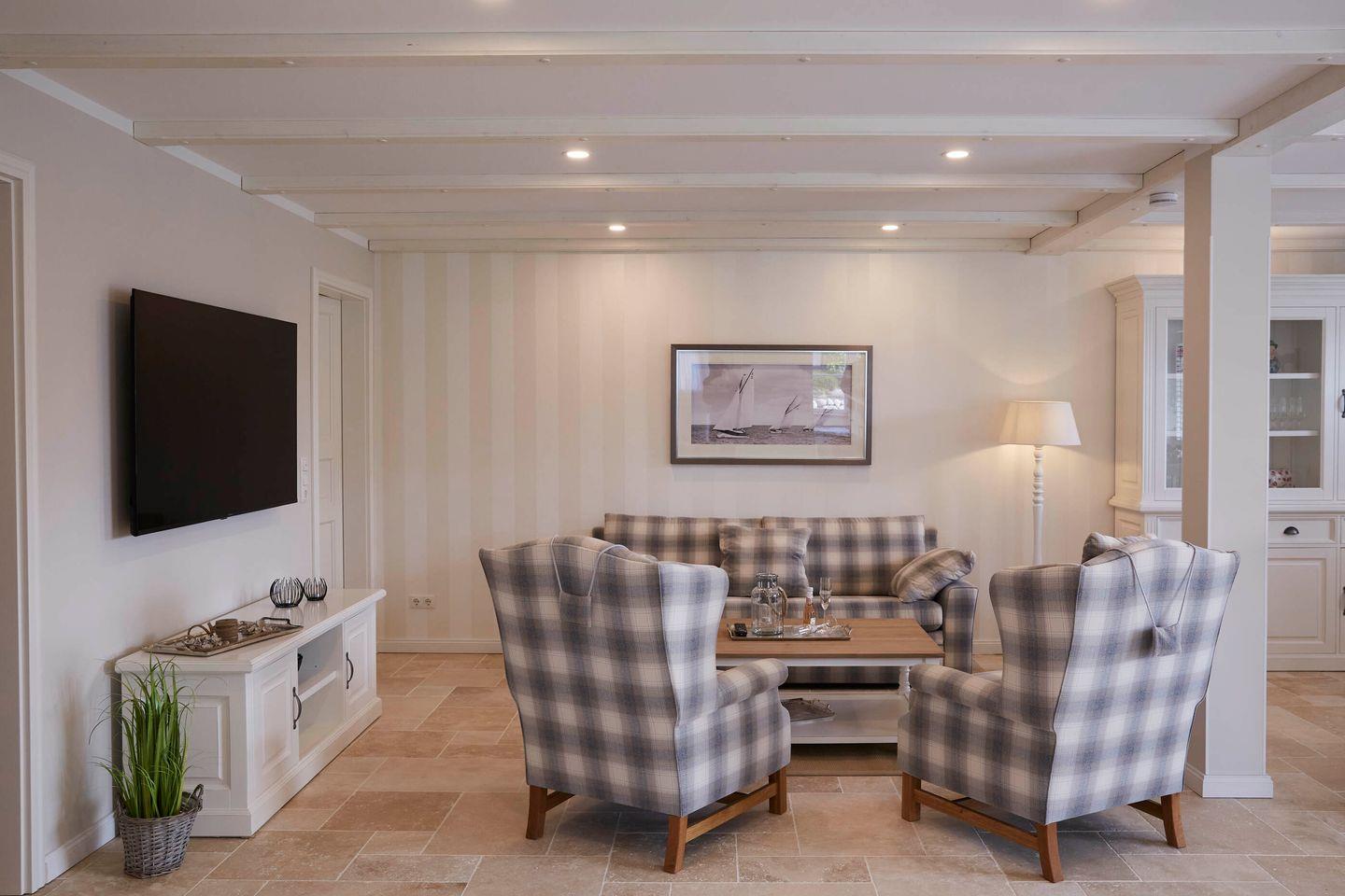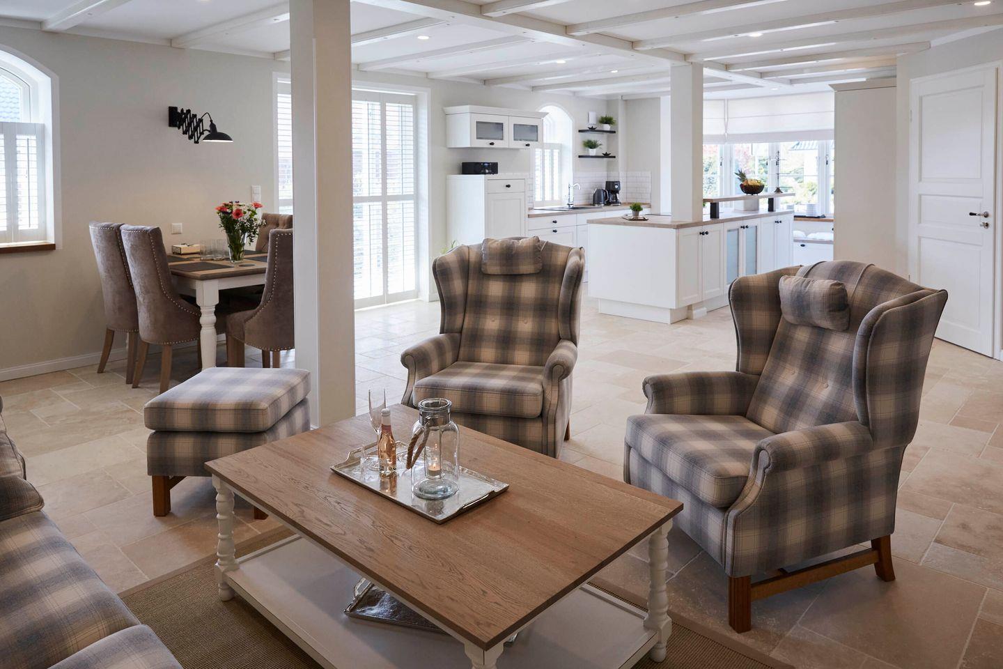Schon von außen erkennen Sie die typisch traditionelle Reetdachbauweise der Region, die durch Elemente, wie die ,,Klönschnacktür‘‘, den stilechten und handgefertigten Holzfenstern mit Sprossen, den Shuttern, der gemauerten Katzentreppe auf dem Dach und vielem mehr zu erkennen ist.