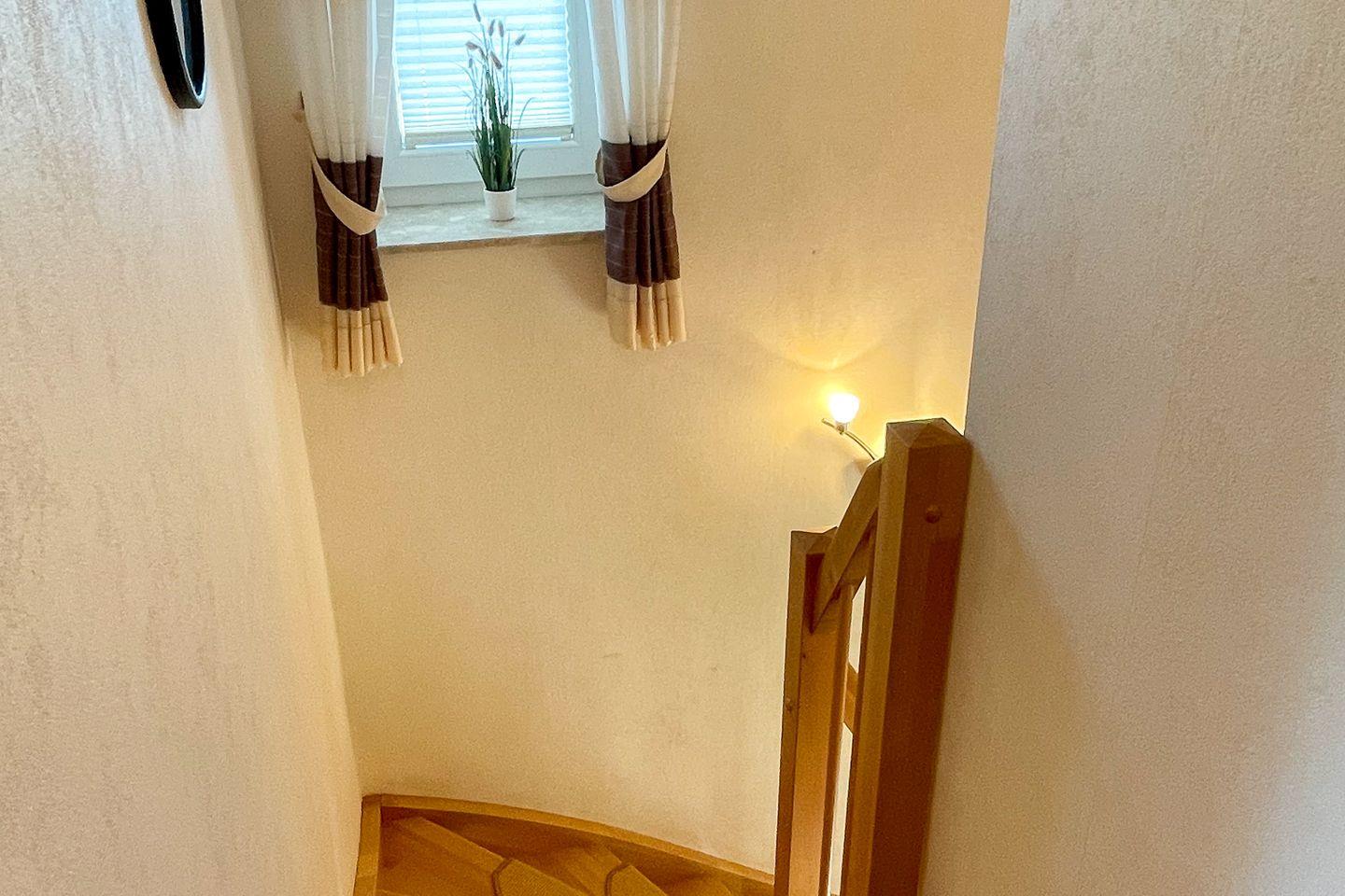Im ersten Stock können bis zu vier Personen übernachten: aufgeteilt auf zwei Schlafzimmer, eins mit Doppelbett, ein weiteres mit zwei Einzelbetten.