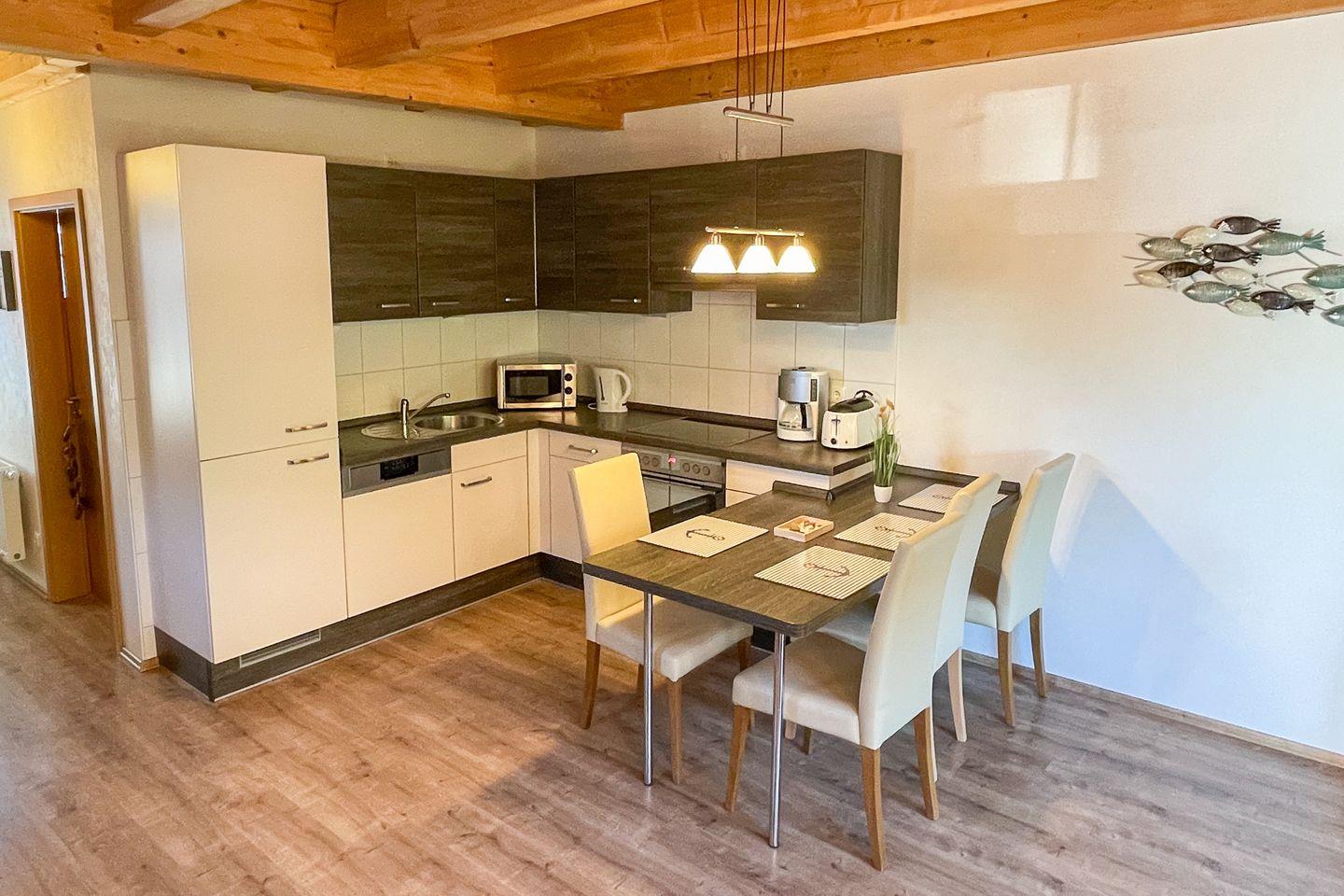 Diese sorgen für ausreichend Privatsphäre und erholsame Nächte. Der offene Wohnbereich verbindet das Wohnzimmer geschmackvoll mit der voll ausgestatteten Küche, die mit modernen Geräten sowie umfangreichen Küchenutensilien ausgestattet ist. Ein Esstisch bildet den Mittelpunkt des Raumes und lädt zu gemeinsamen Mahlzeiten ein.