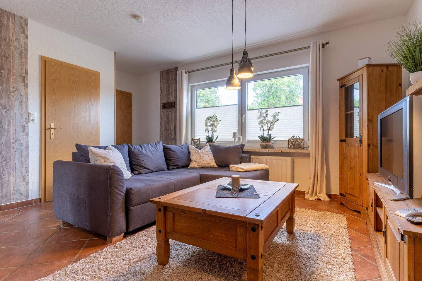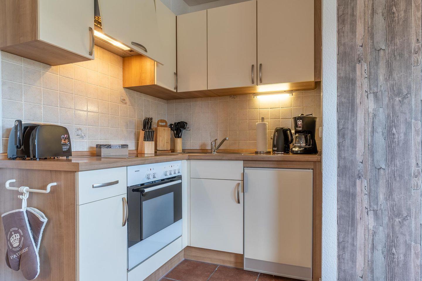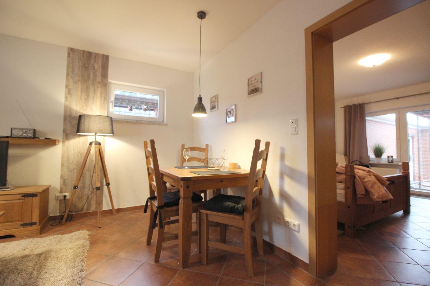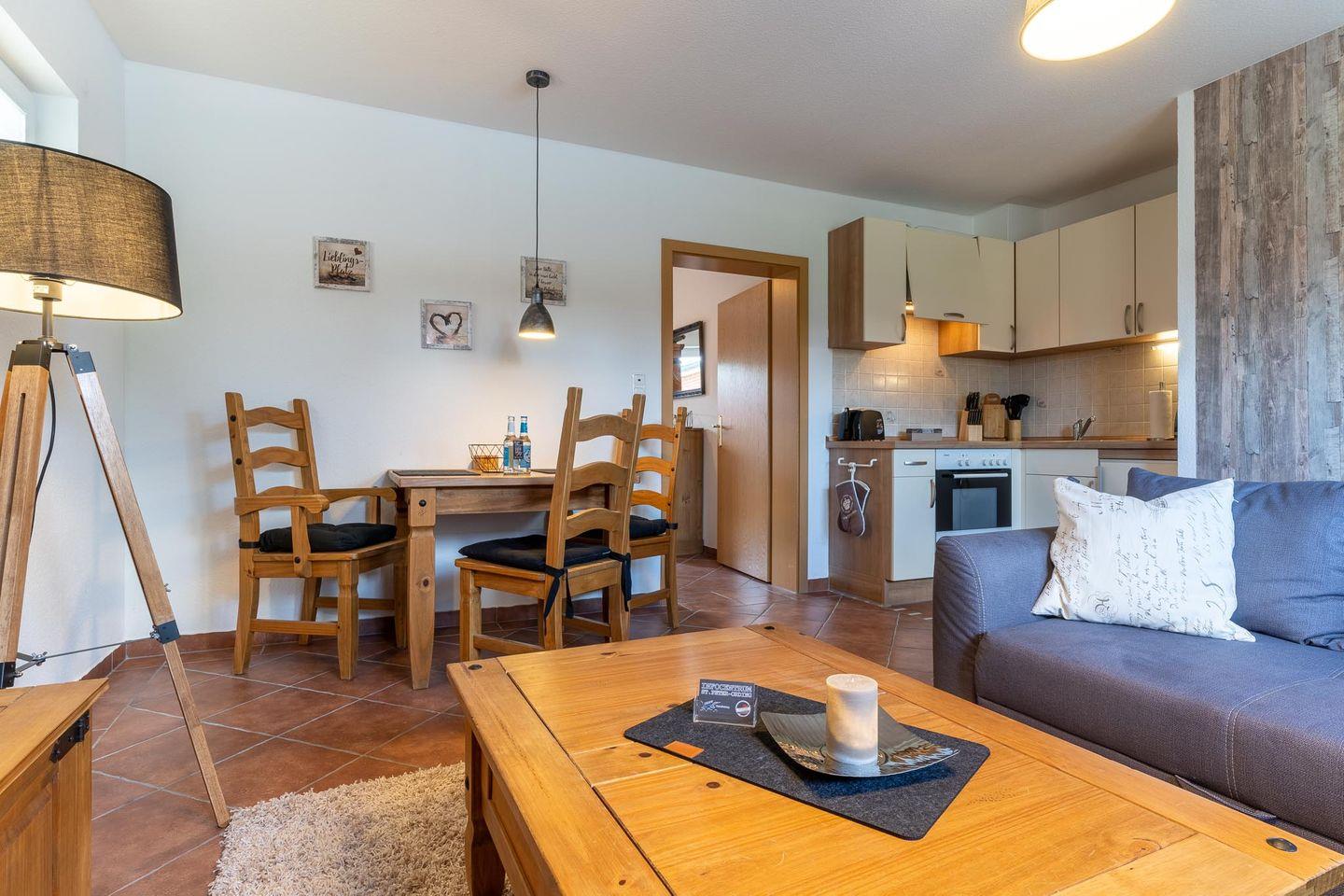 Tauchen Sie ein in eine Oase der Ruhe und Erholung in unserer wunderschönen Erdgeschoss-Wohnung. Die geräumige und liebevoll eingerichtete Ferienwohnung bietet Platz für 2 Personen und ist der perfekte Ort, um dem Alltag zu entfliehen und die Seele baumeln zu lassen. Durch die Haustür betreten Sie die gemütliche Wohnküche, die mit allen Annehmlichkeiten ausgestattet ist, die Sie für einen entspannten Urlaub benötigen. Hier können Sie gemeinsam kochen, sich am Esstisch niederlassen oder auf dem bequemen Schlafsofa entspannen.