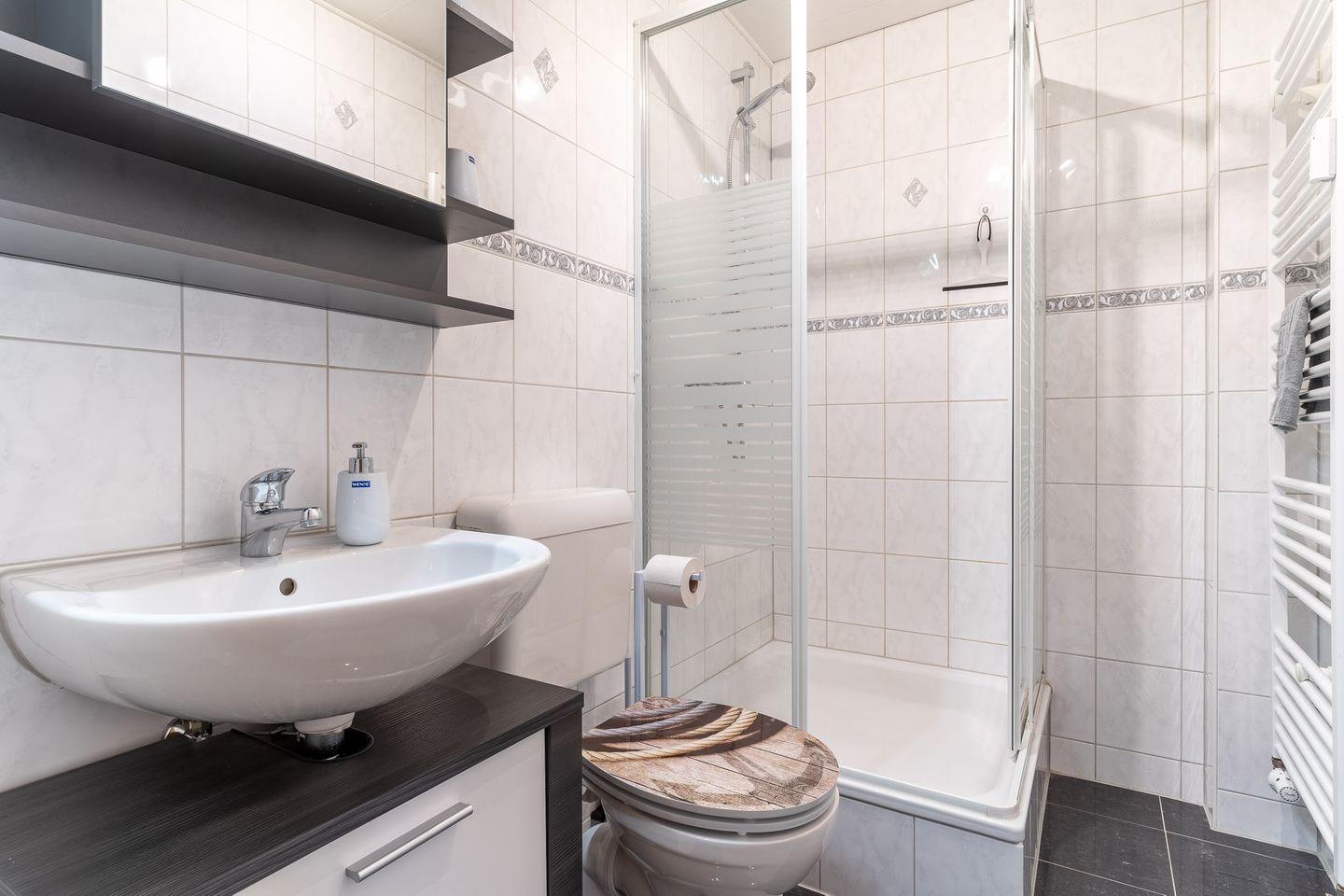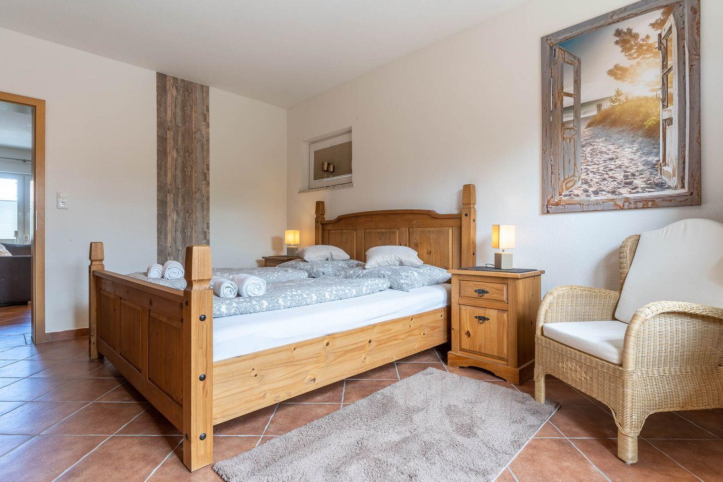 Das Schlafzimmer mit seinem bequemen Doppelbett und dem Zugang zur möblierten Terrasse lädt zum Träumen und Entspannen ein. Hier können Sie den Tag ausklingen lassen und den Blick in die Natur genießen. Das moderne Duschbad bietet genügend Platz für Ihre Utensilien und rundet das Wohlfühlerlebnis perfekt ab.