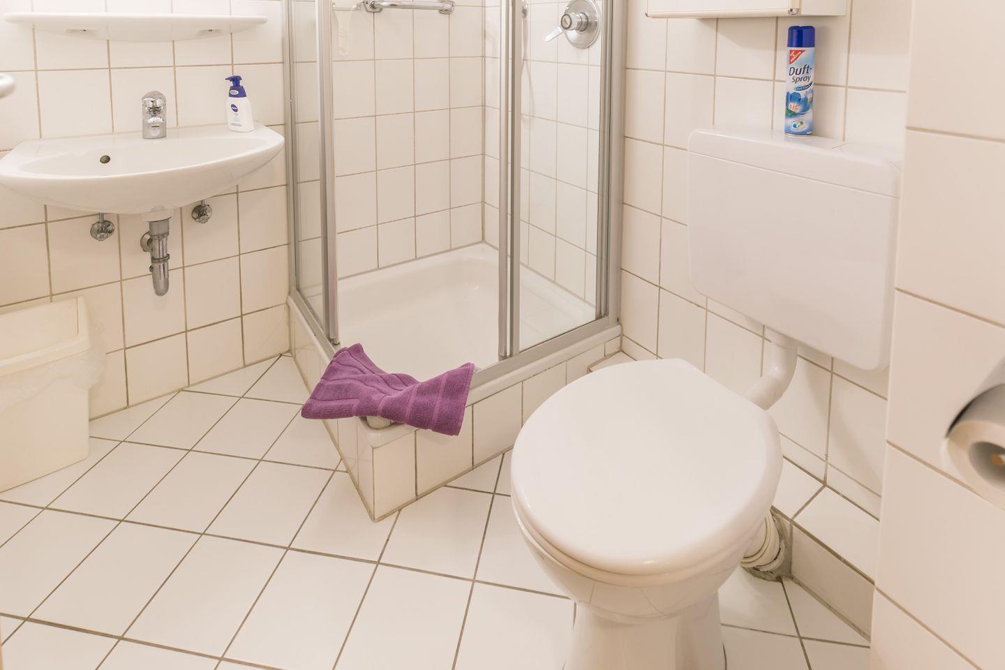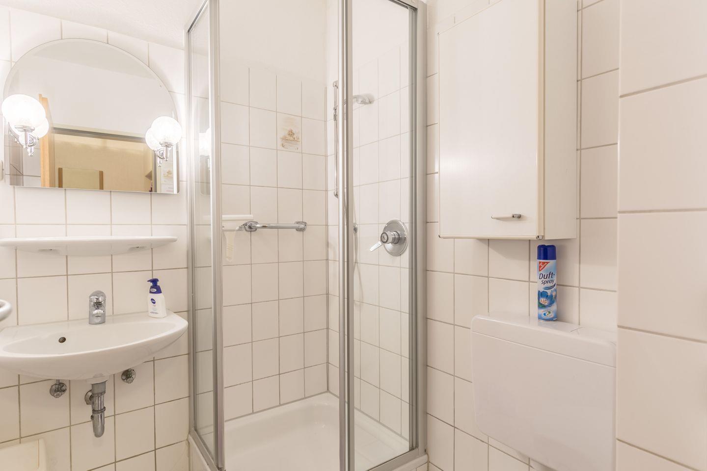 Dusche, WC, Spiegel, Waschbecken, Haartrockner, Hängeschrank, Abluft