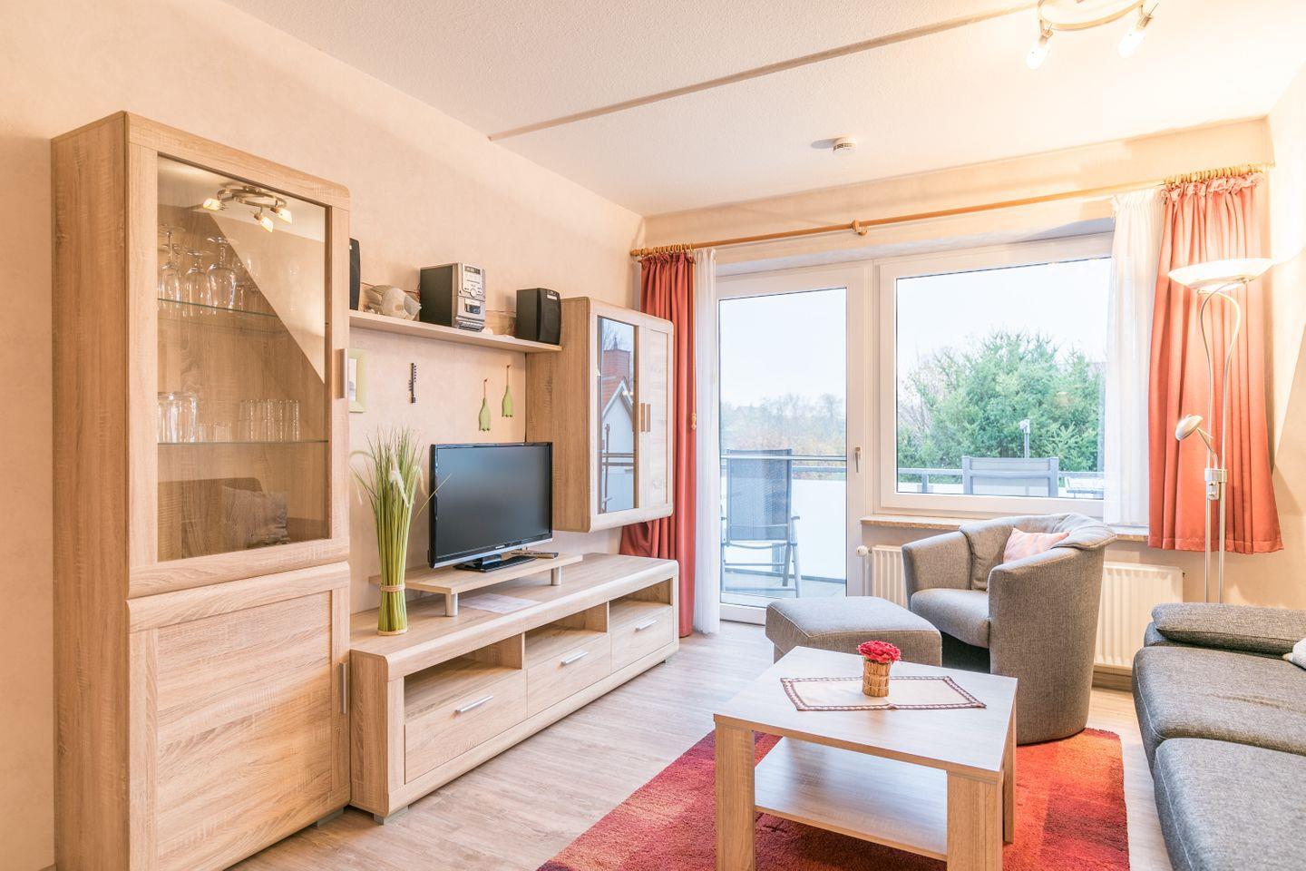 Sofa mit Schlaffunktion, Sessel mit Fußhocker, Couchtisch, Flachbild-TV, Schrank, Radio, CD-Player, Esstisch mit 4 Stühlen, Fliegengitter an der Terrassentür, Zugang zum Balkon mit Südlage