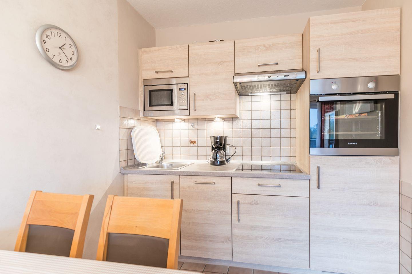 Einbauküche, Herd mit Cerankochfeld, Backofen, Kühlschrank mit Gefrierfach, Geschirrspüler, Kaffeemaschine, Microwelle, Wasserkocher, Toaster