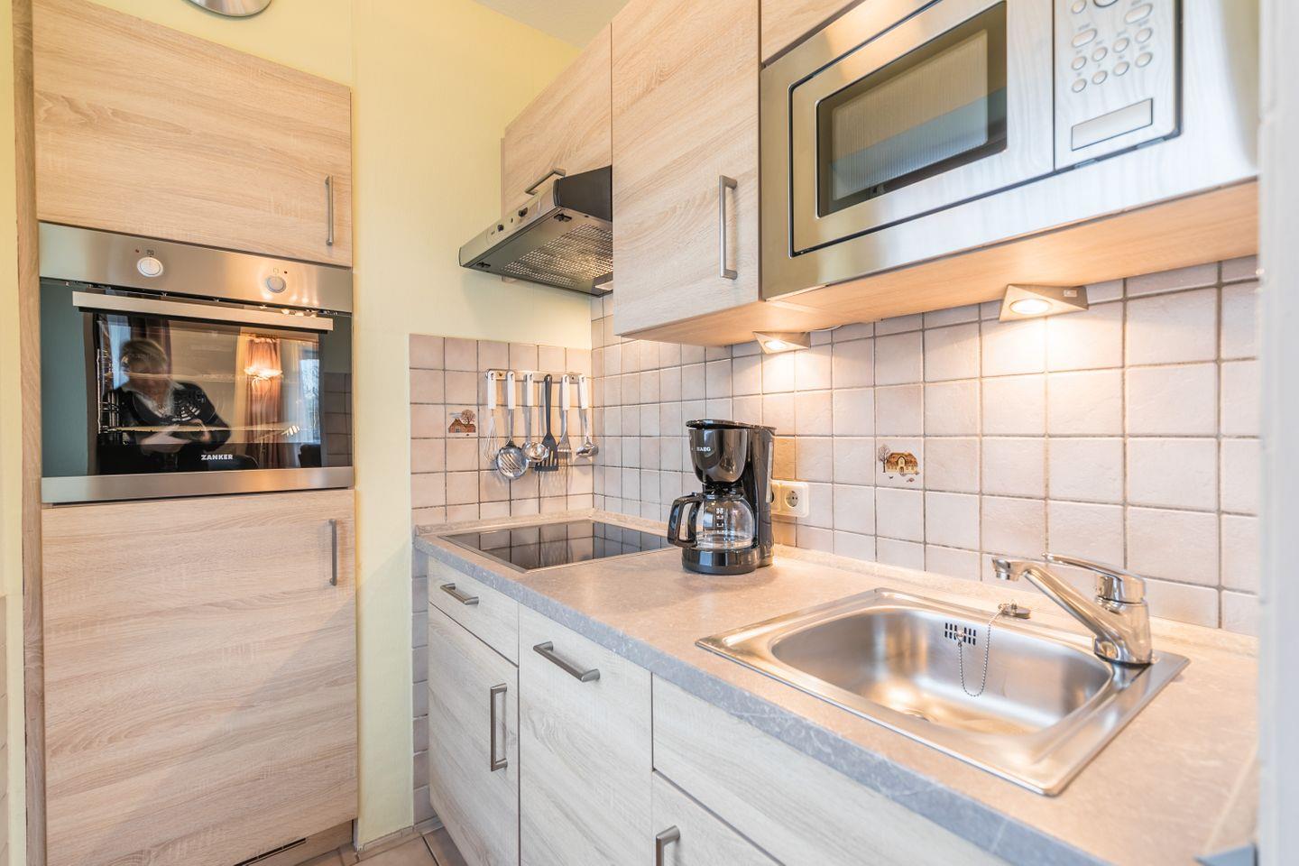 Einbauküche, Herd mit Cerankochfeld, Backofen, Kühlschrank mit Gefrierfach, Geschirrspüler, Kaffeemaschine, Microwelle, Wasserkocher, Toaster