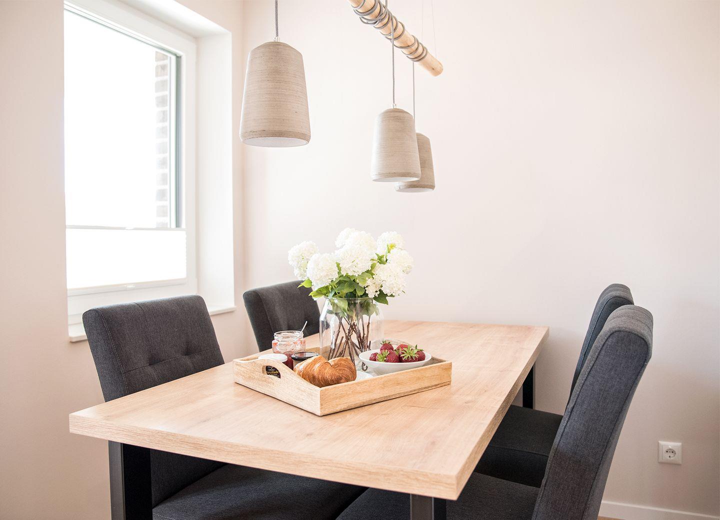 eingerichtet. Ebenso befindet sich in dem Raum ein schöner Esstisch, an dem man sich bei gutem Essen und netten Gesprächen