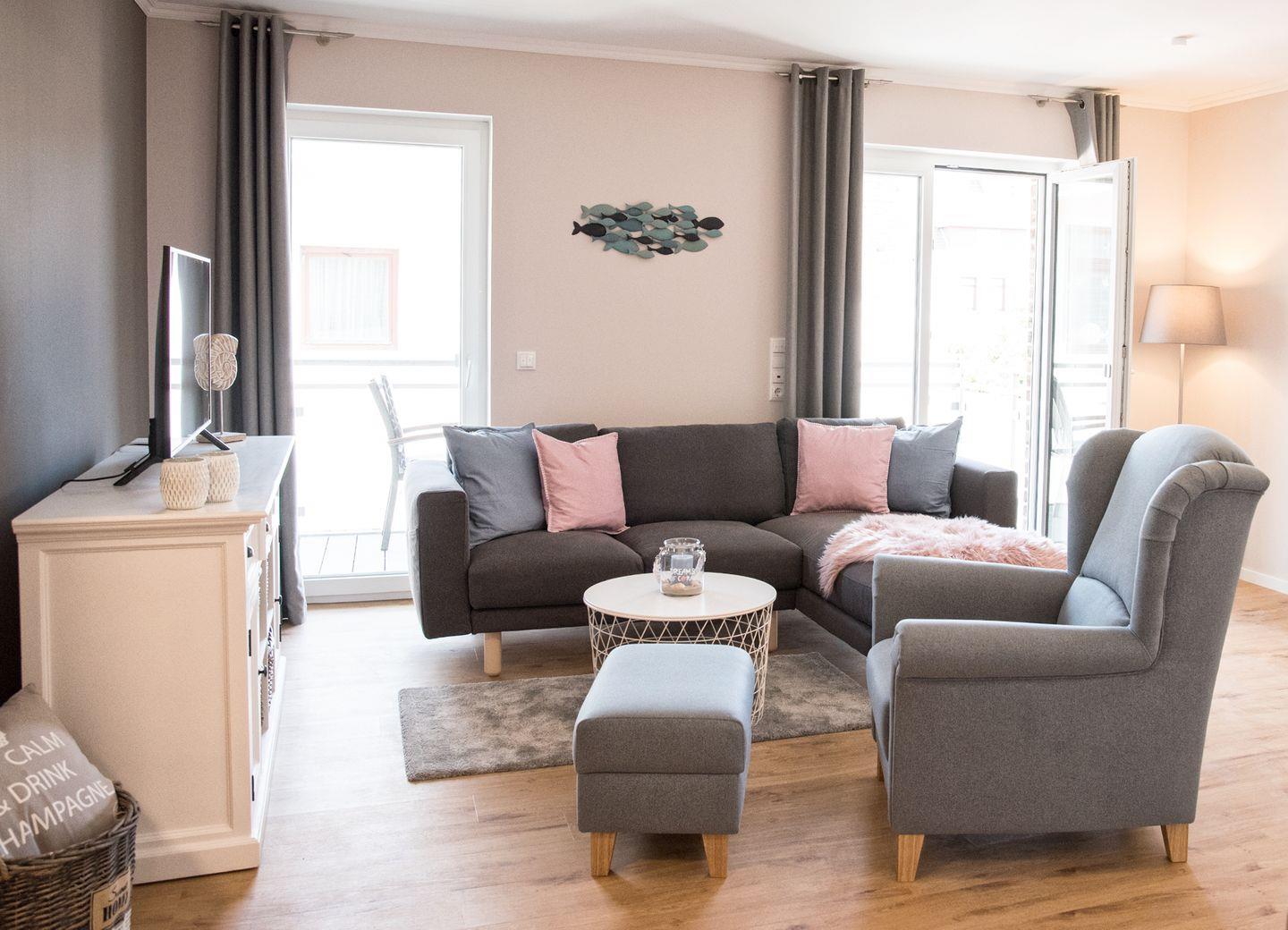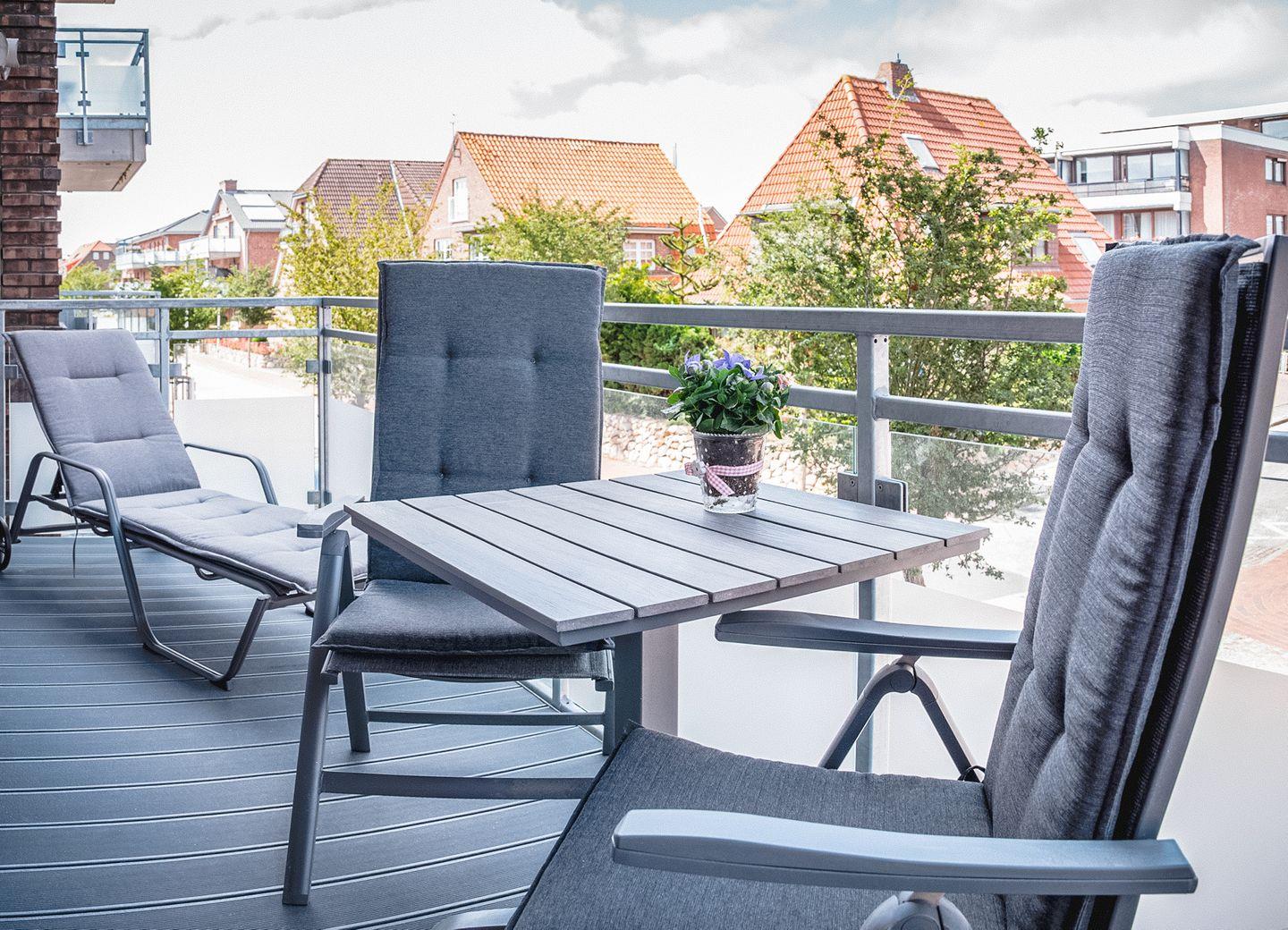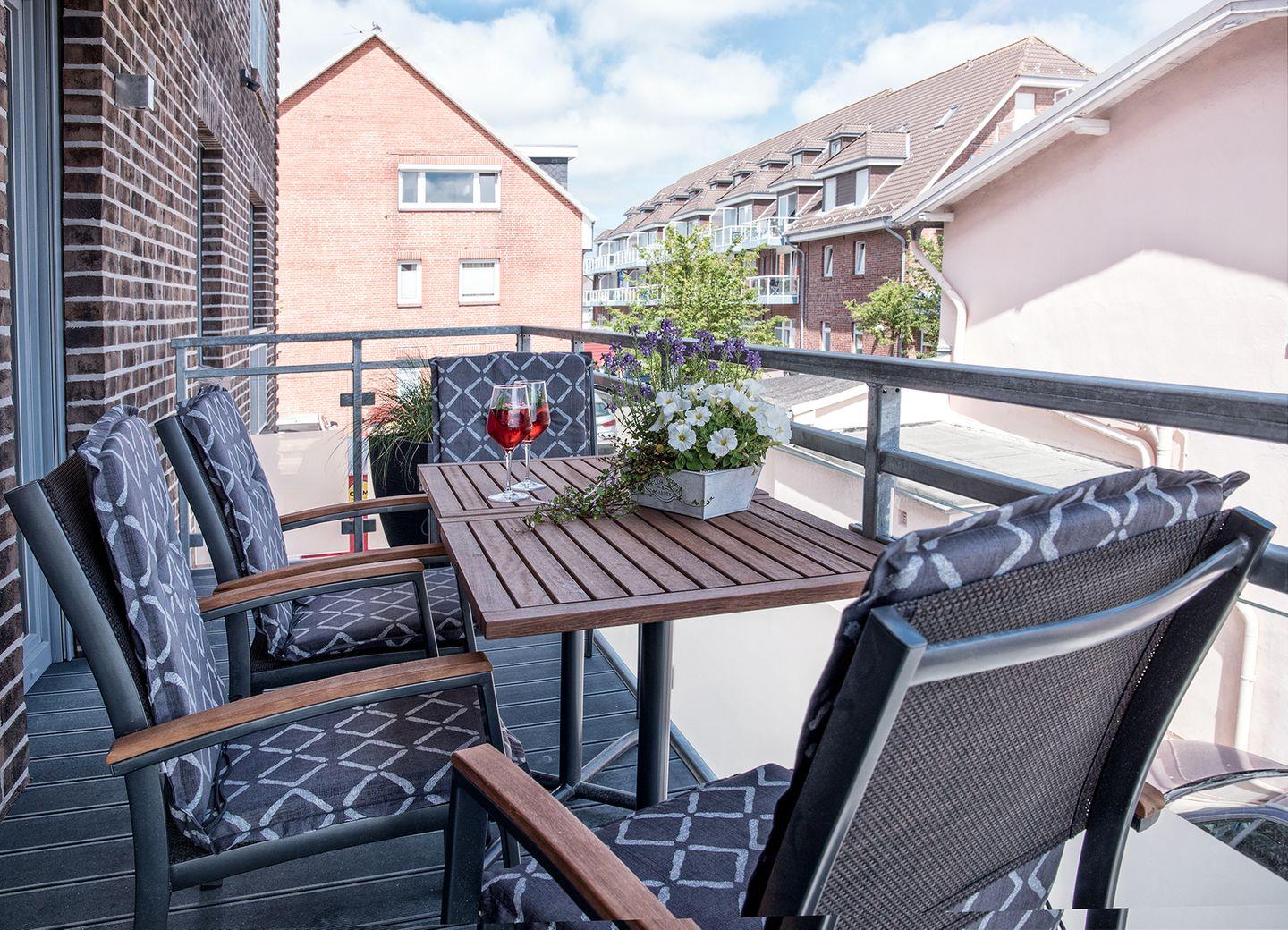 Der Ost- Balkon ist von dem großen Wohn- Essbereich zu erreichen, dieser ist mit bequemen, stylischen Wohnzimmermöbeln