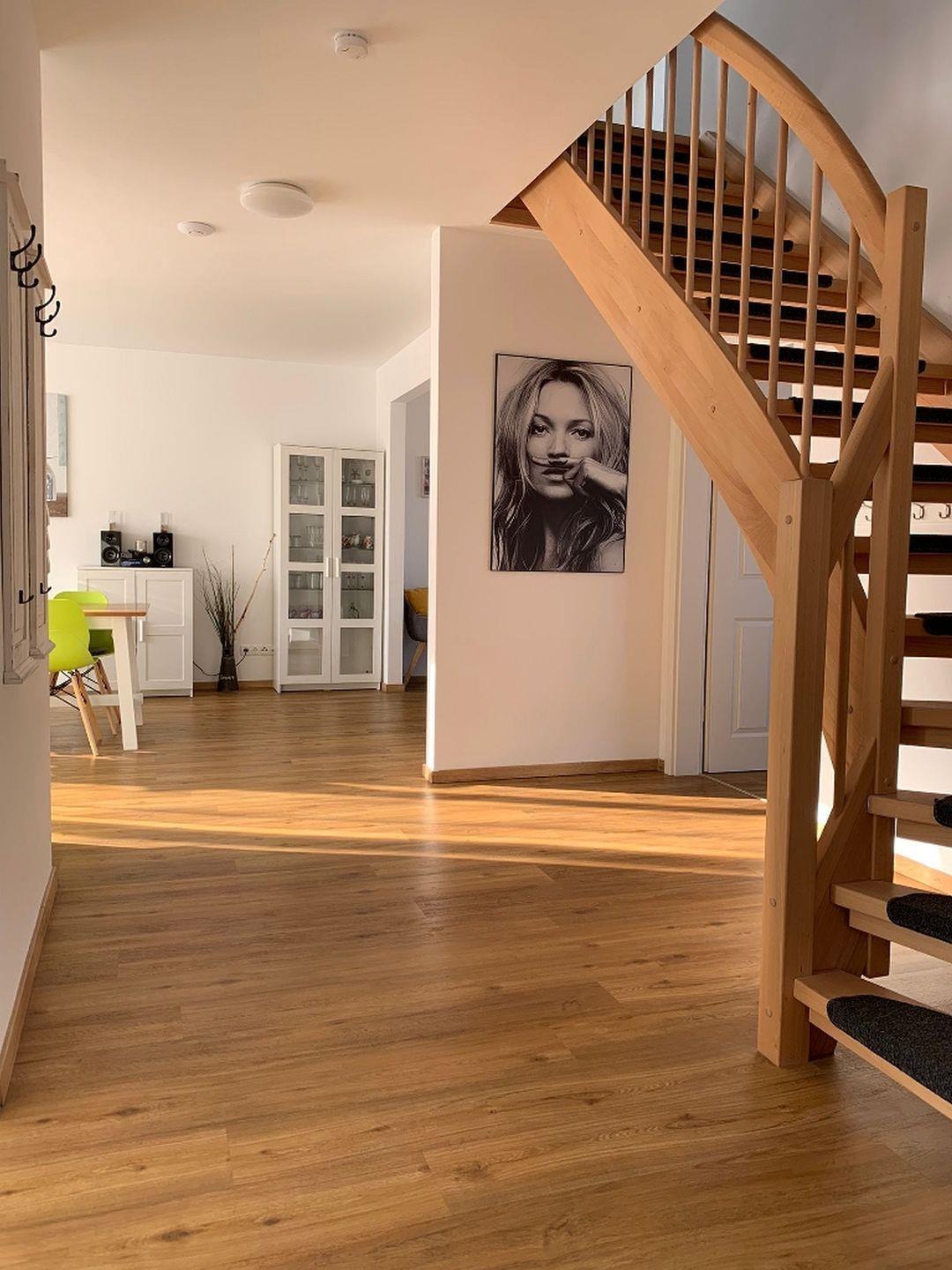 Die Eingangstreppe vom Erdgeschoss ins 1te O.G. (bei Einschränkungen bzw. Behinderungen nicht zu empfehlen) ist oben mit einem Kindergitter gesichert, zur oberen Treppe ist kein Gitter vorhanden.