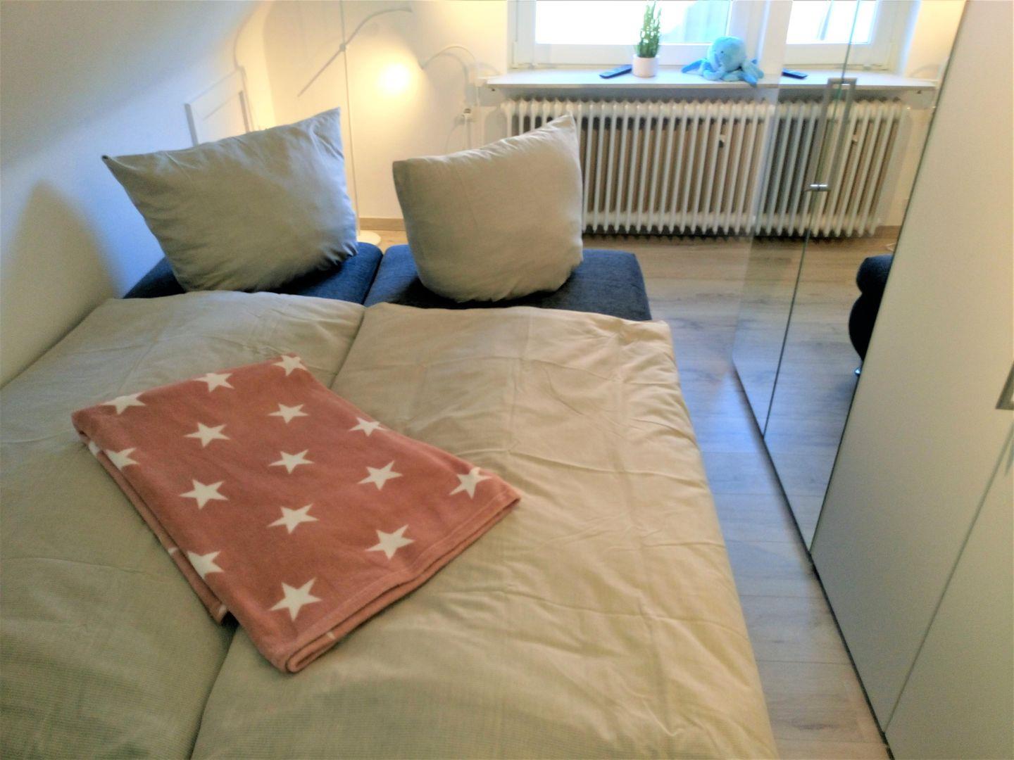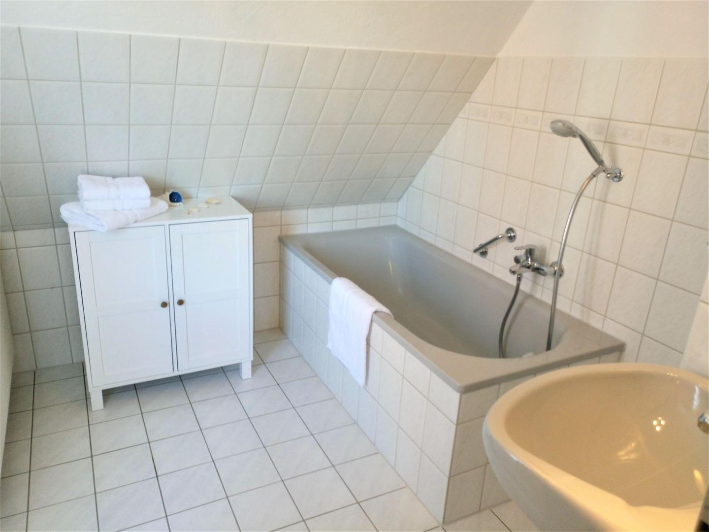 In der oberen Etage gibt es 2 weitere Schlafzimmer, eines mit einem bequemen Doppelbett ( 2 Einzelmatratzen), Smart-TV Gerät und Kleiderschrank möbliert in dem 2ten Schlafzimmer steht eine Schlafcouch, die auf 1,60m ausgezogen werden kann und 2 Personen Platz bietet. Von diesem Raum aus geht es in ein weiteres Bad mit Balkon, mit Waschbecken und Badewanne.,
