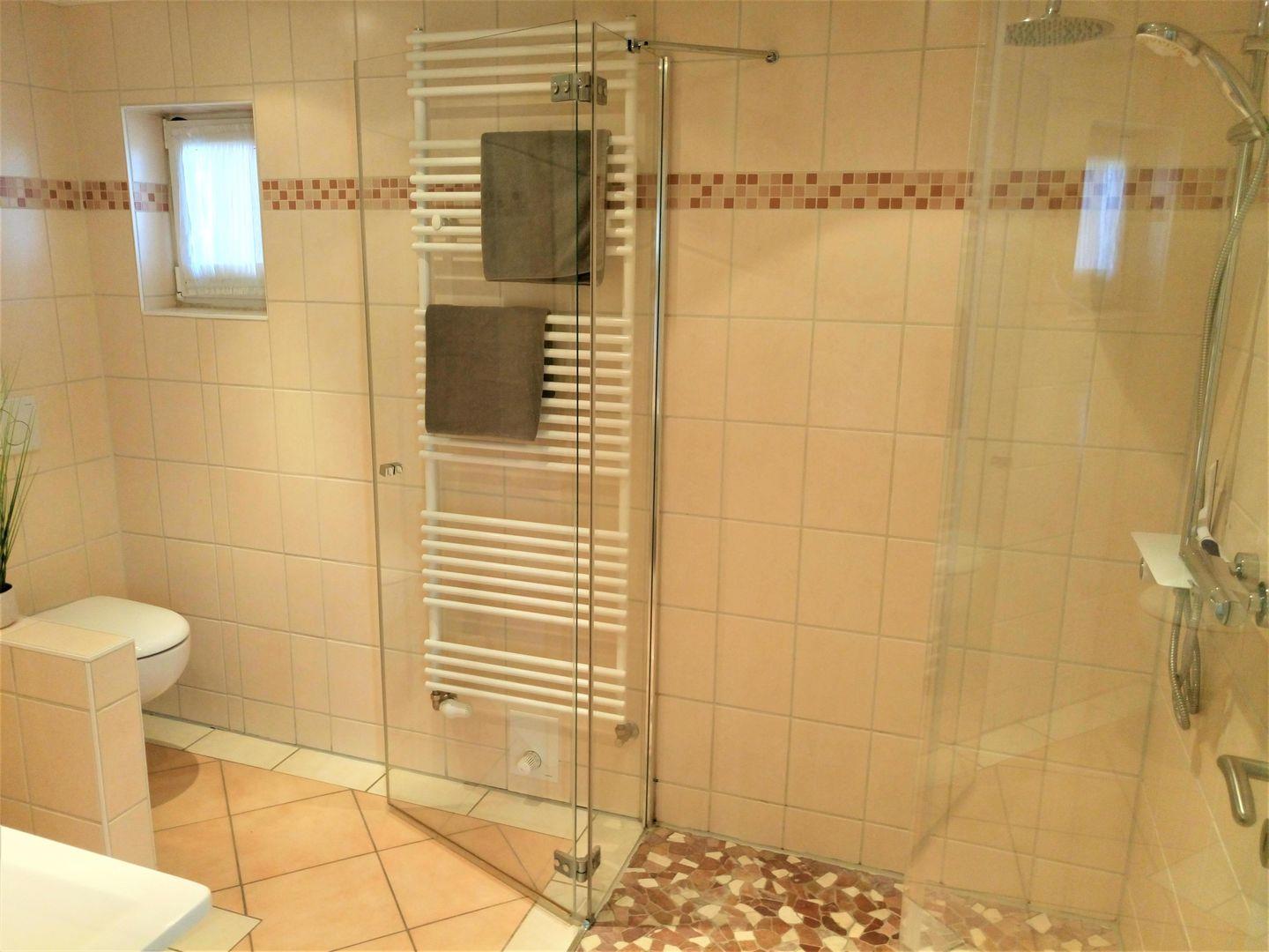 Eines der 3 Schlafzimmer befindet sich ebenso im Erdgeschoss, es ist mit einem hochwertigen Doppelbett (2 Einzelmatratzen), TV- Gerät und einem Kleiderschrank eingerichtet. Durch ein Tageslicht- Badezimmer mit einer ebenerdigen Dusche, Handtuchwärmer und Fußbodenheizung ist die untere Etage auch gut für Senioren oder Menschen mit leichten Einschränkungen nutzbar.