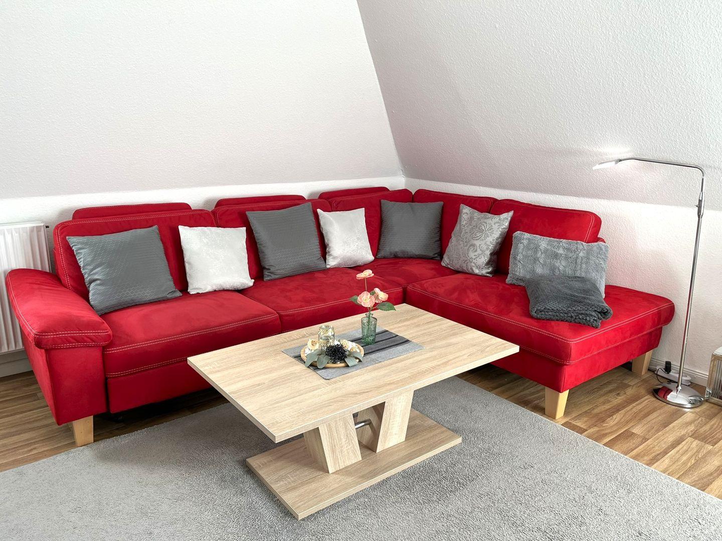 Der gemütlich Wohnraum ist mit einer großen Wohnlandschaft ausgestattet, auf der man es sich richtig bequem machen kann, außerdem ist ein Esstisch vorhanden.