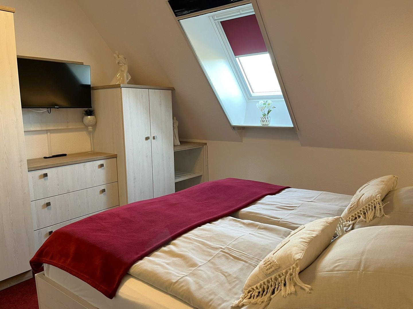 (2 Einzelmatratzen), einem Kleiderschrank und einem TV- Gerät möbliert. Für Kinder bis 12 Jahren kann man noch ein zusätzliches Bett herausfahren, so dass insgesamt 3 Schlafmöglichkeiten bereit stehen. Der Raum kann für einen guten Schlaf mit Veluxrollo verdunkelt werden.