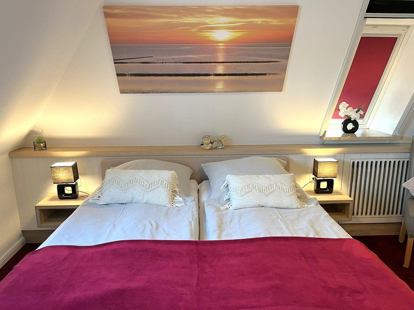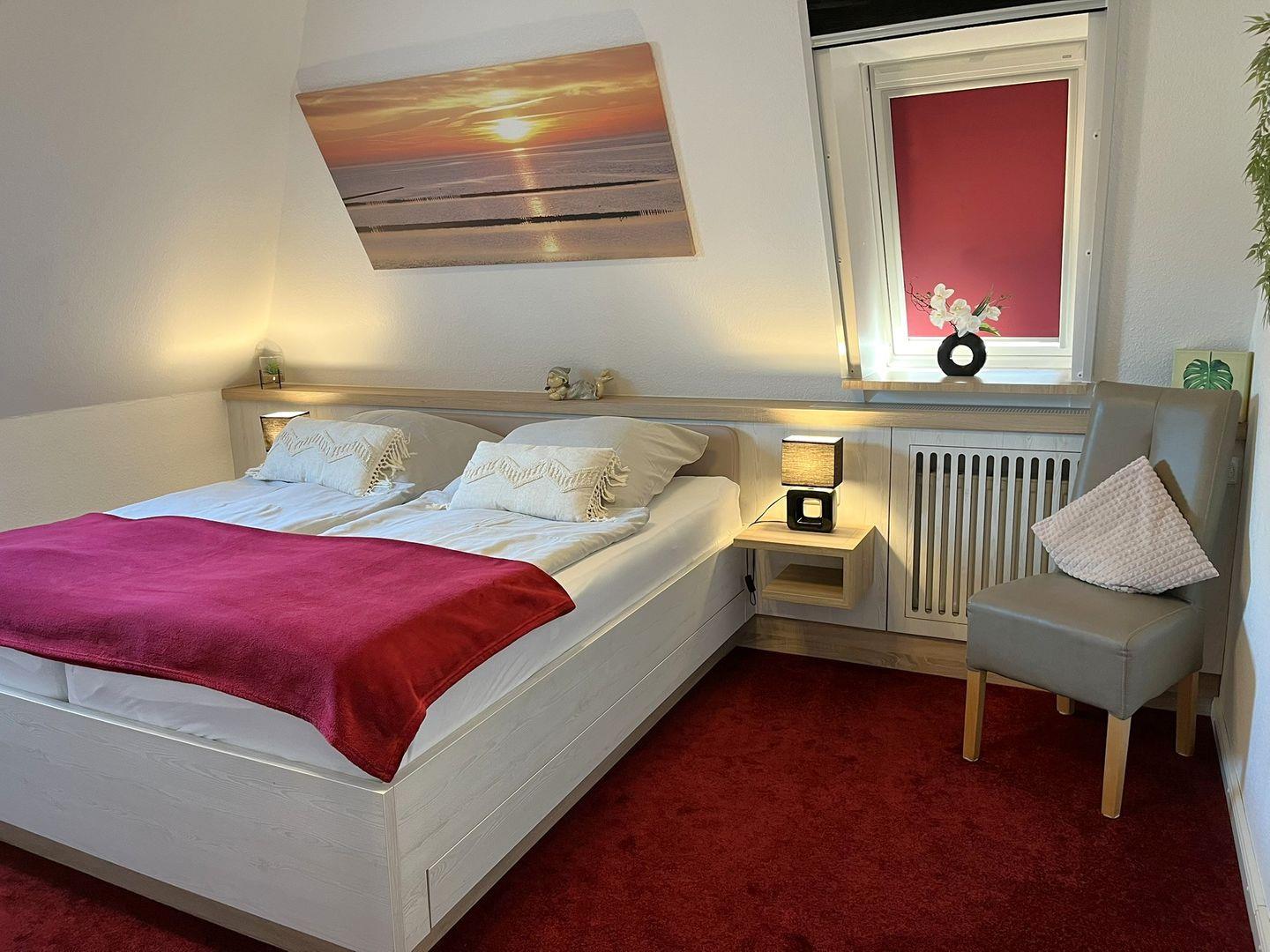 Das geräumige Schlafzimmer ist mit einem hochwertigen Doppelbett
