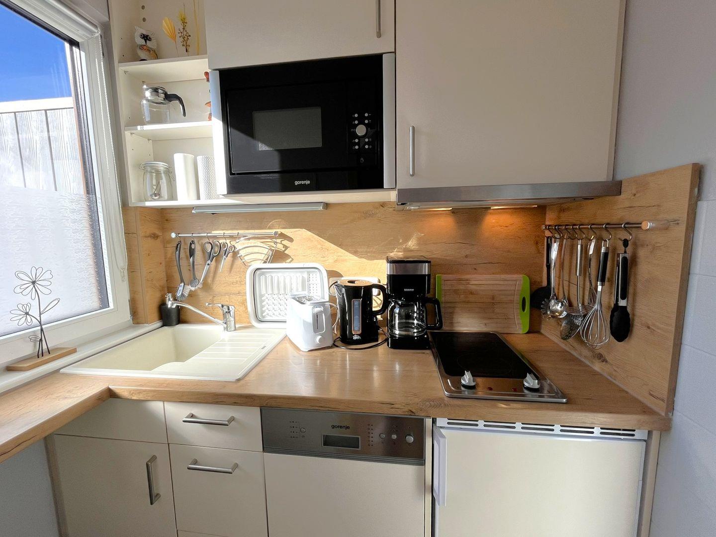 Die Küche ist zwar klein aber wirklich mit allem ausgestattet, was man braucht. Geschirrspüler, Mikrowelle, Toaster, Eierkocher und einem kleinen transportablen Backofen mit Grillfunktion. Es sind aber nur 2 Kochplatten vorhanden.