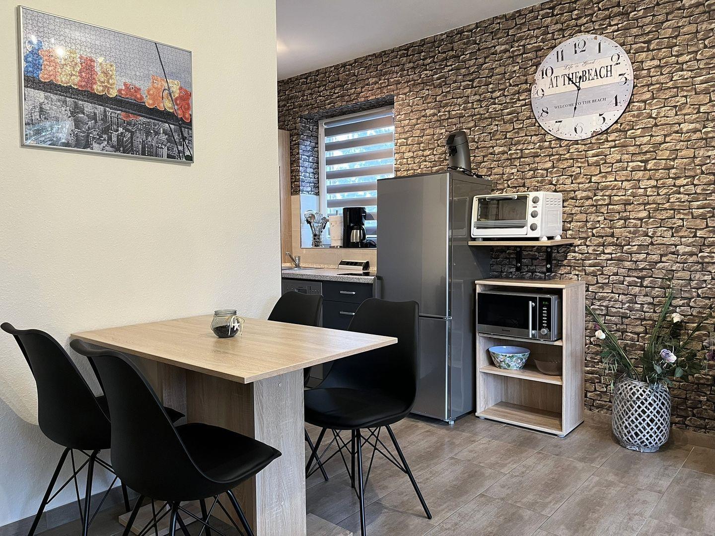 Die Küchenzeile ist mit einem Zwei- Platten- Ceranfeld, einem Kühlschrank mit kleinem Gefrierfach, einem Minibackofen und natürlich mit Geschirr und Kochutensilien ausgestattet.