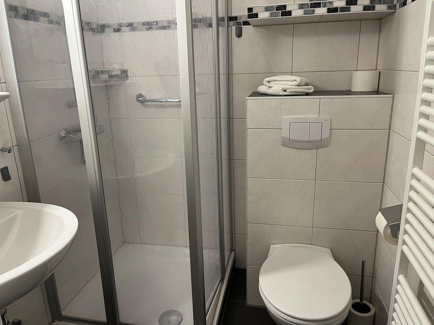 Für einen guten Start in den Tag steht ein Badezimmer mit Dusche zur Verfügung.